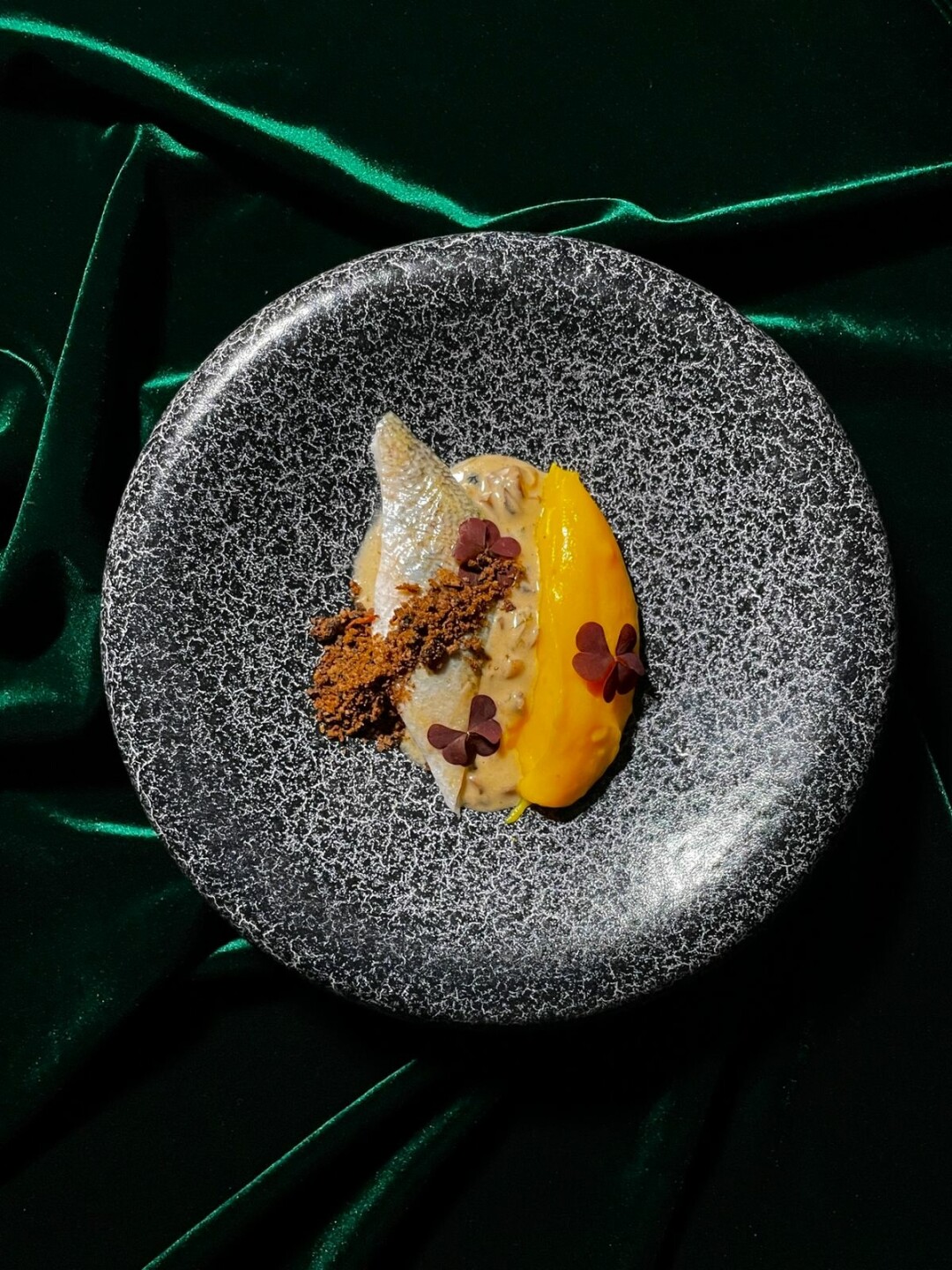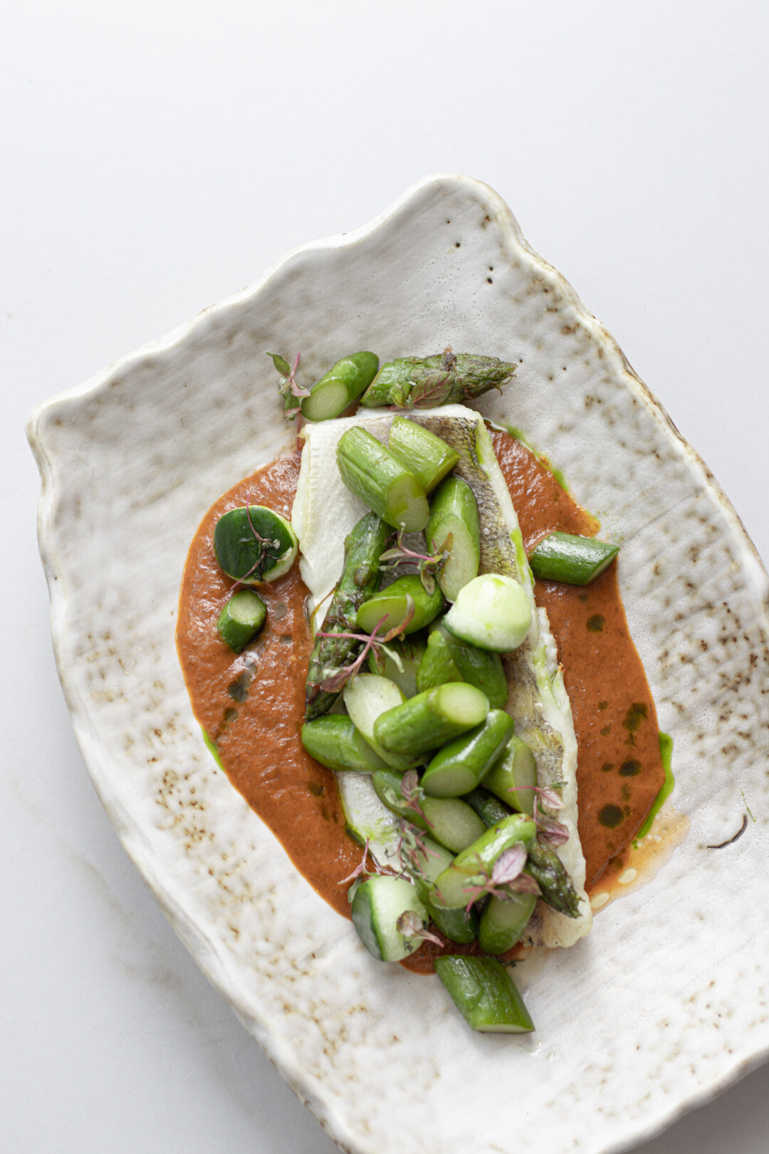 - Волжский судак с кремом из печеных овощей и спаржей из Сергача.