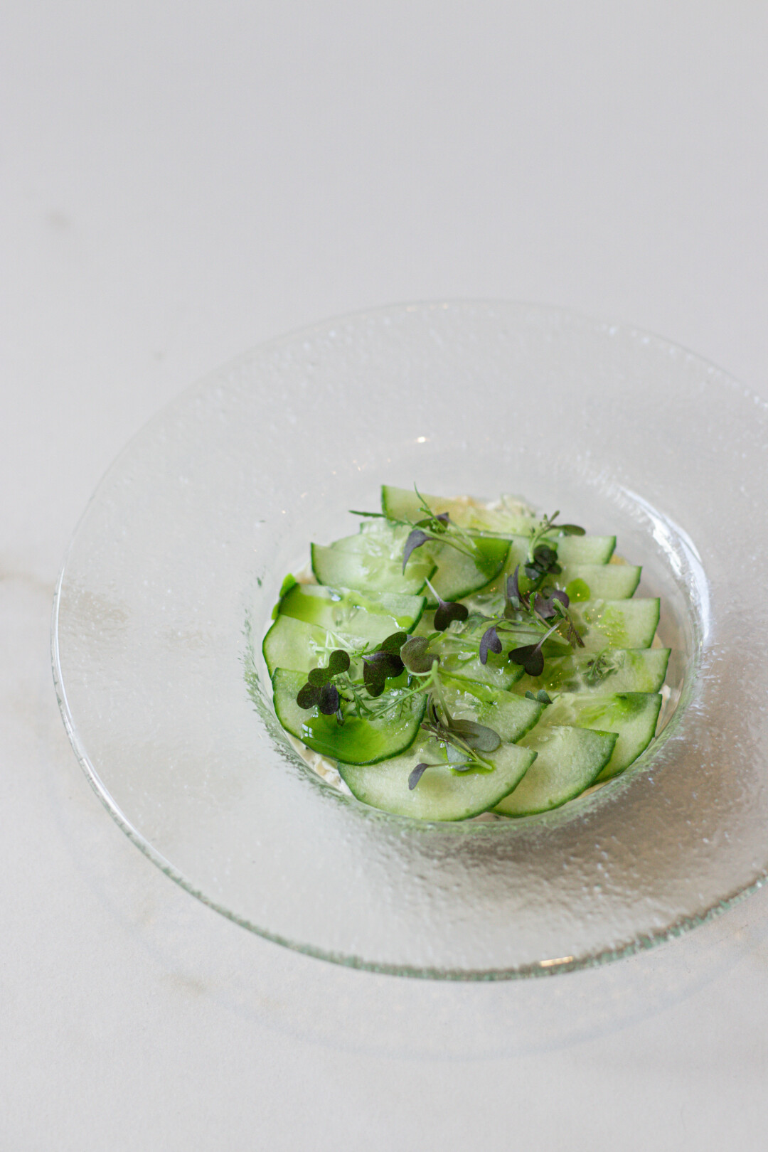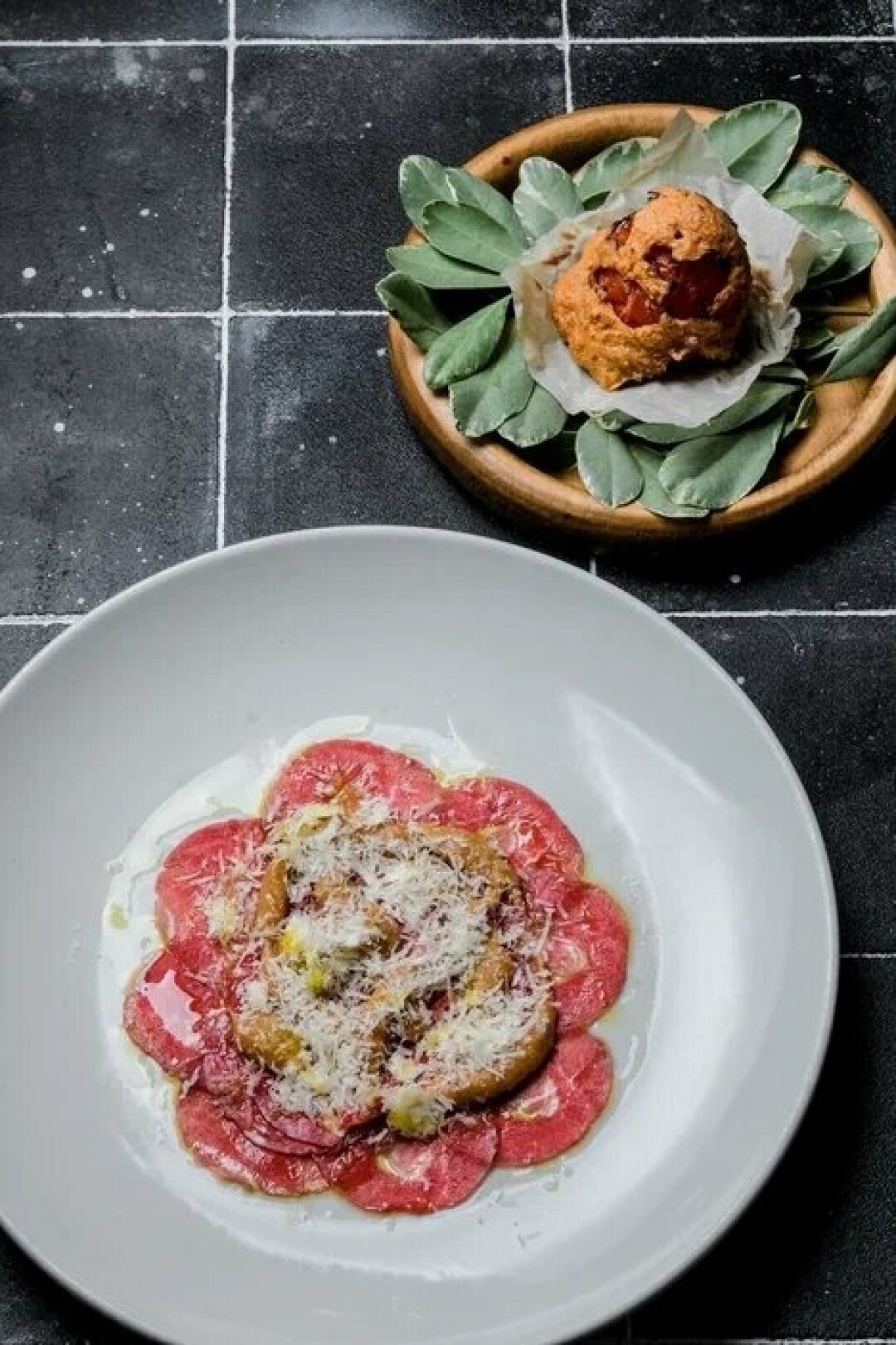 - Карпаччо из фермерской телятины с запеченным в ковернинской соли горьковским помидором с картофельной сгущенкой.