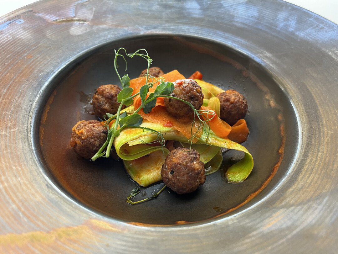 - Фрикадельки из косули с местными овощами и томатным соусом.