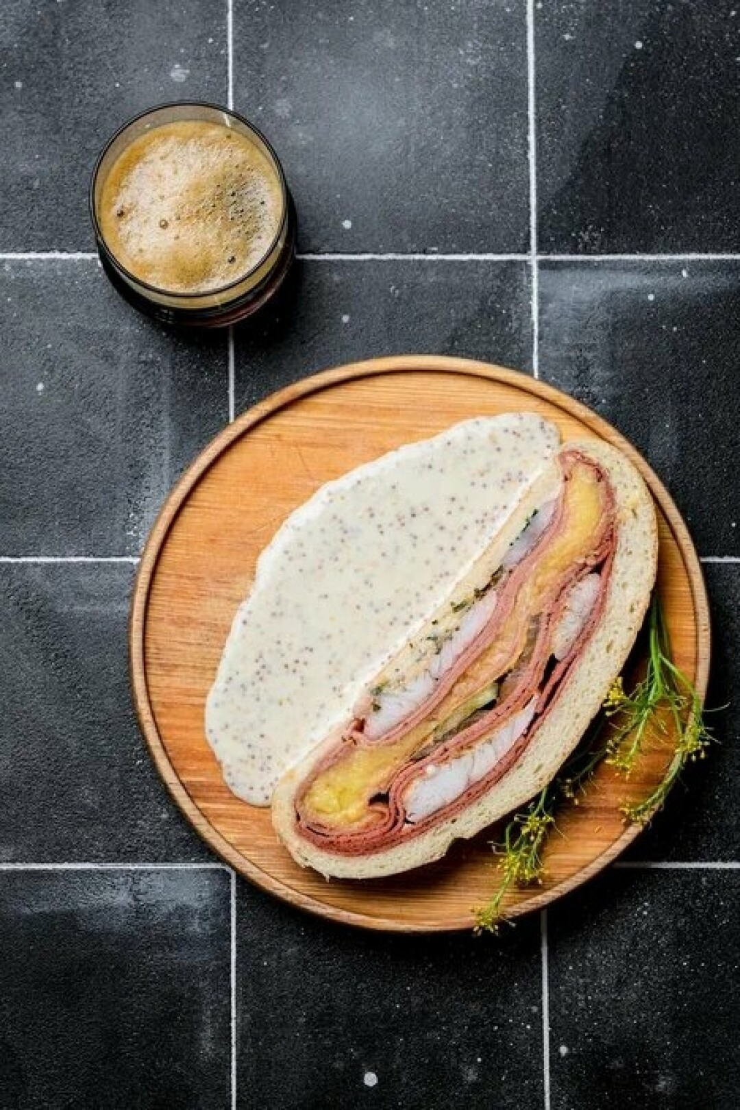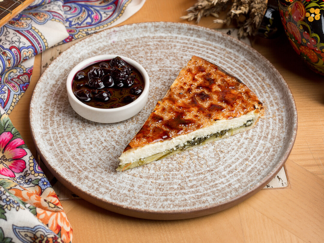 - Кулебяка с волжским судаком и картофелем под горчичным соусом.