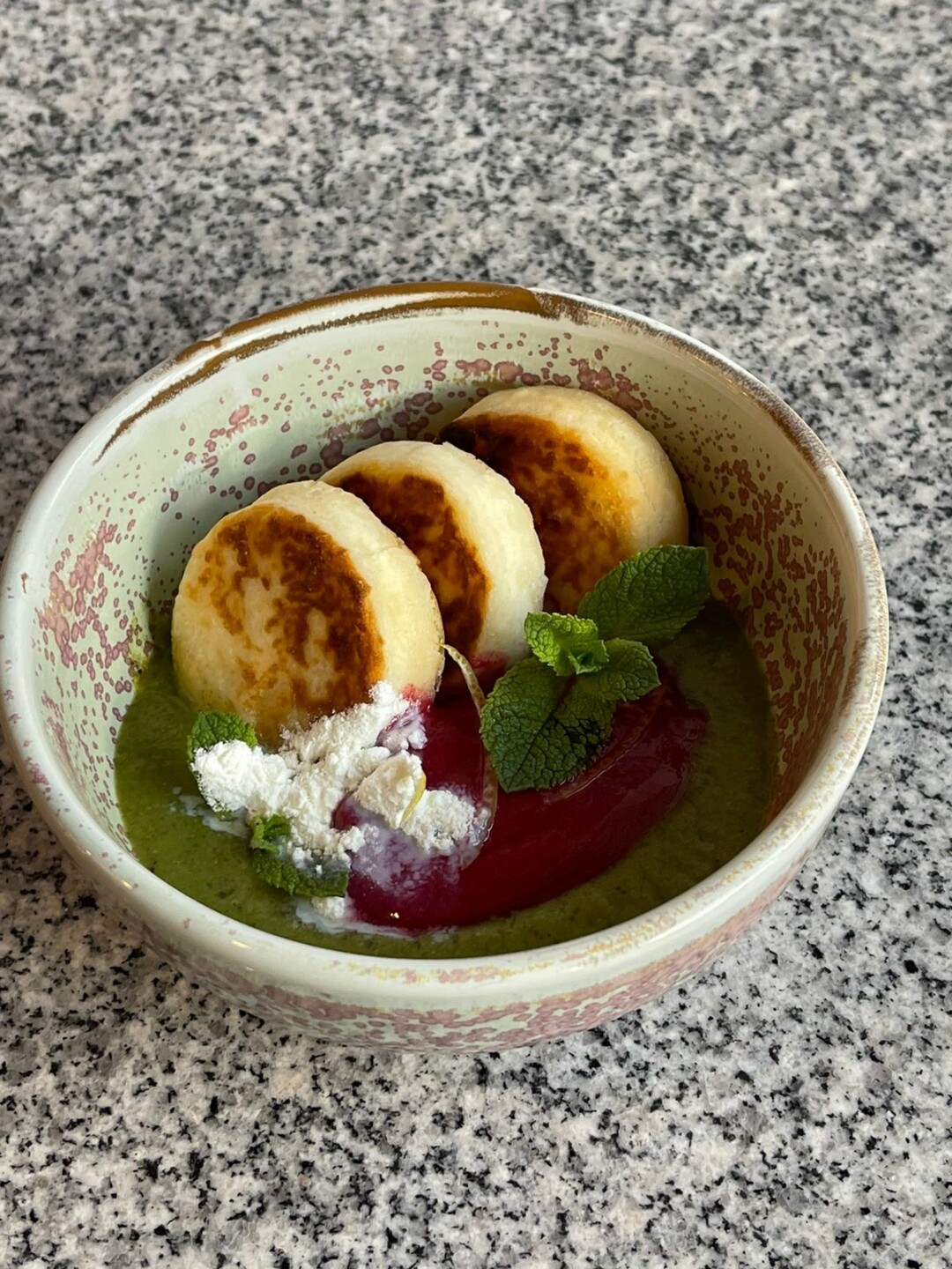- Сырники с крапивным муссом и малиновым сорбетом.