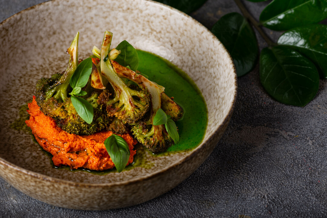 Если хочется в первую очередь «есть глазами» – отправляйтесь в Skoba за морковным хумусом, который здесь подают в компании нарядной брокколи и яркого оливкового соуса. Настоящий карнавал на тарелке!