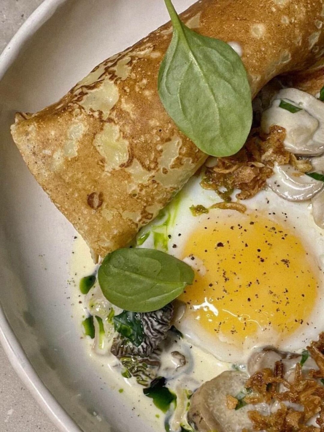 C 20 февраля можно заказывать блинчики с томленой телячьей щекой и сметаной, с икрой из боровиков и сморчками, с лососем и двумя видами икры и со сливочным кремом и спелой хурмой.