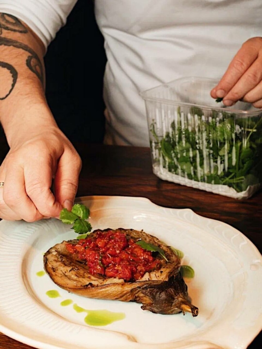 Печеный баклажан с лечо из сочных томатов, фиолетовый картофель со сморчками и трюфельным соусом, тыквенный крем-суп с обожженным брокколи и кафирским лаймом и перец рамиро с растительным мясом и соусом маринара. На десерт канноли с цитрусовым кремом и малиной.