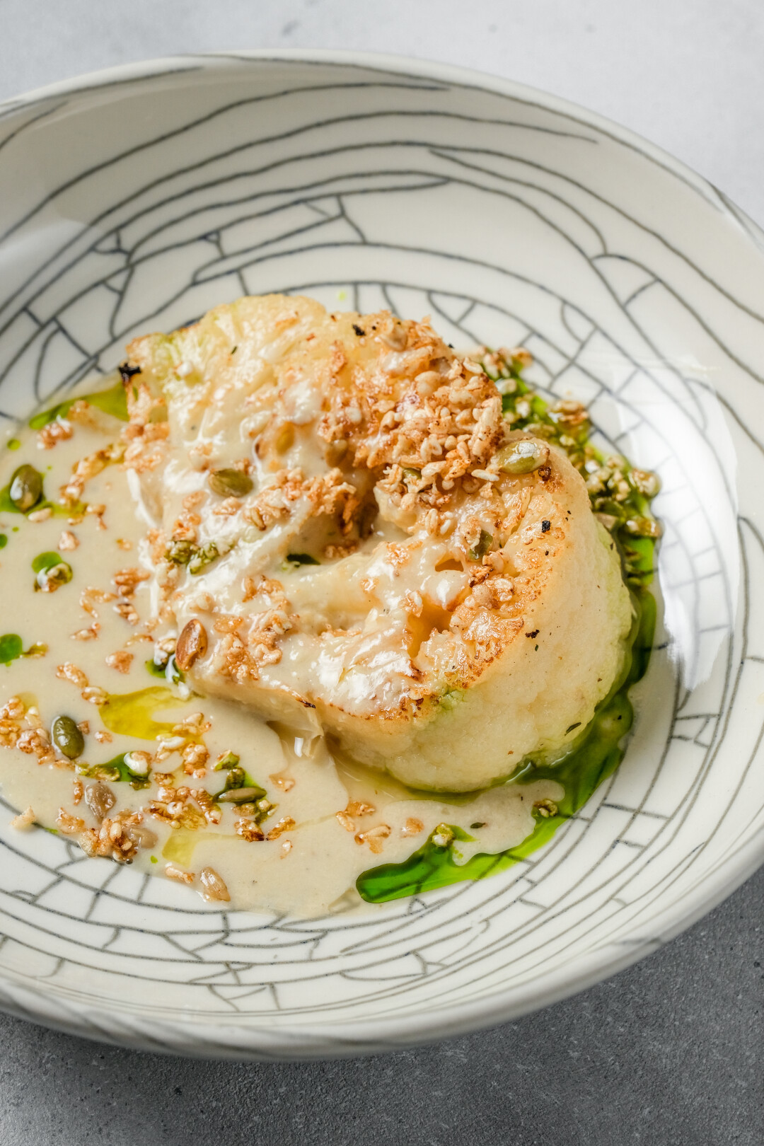 Можно попробовать печеные овощи с кремом из граната и кедровыми орешками, террин из корня сельдерея с соусом из кешью, хумус с артишоками, крем-суп из цветной капусты со сморчками. А также стейк из цветной капусты с соусом из печеного чеснока с трюфельным маслом.