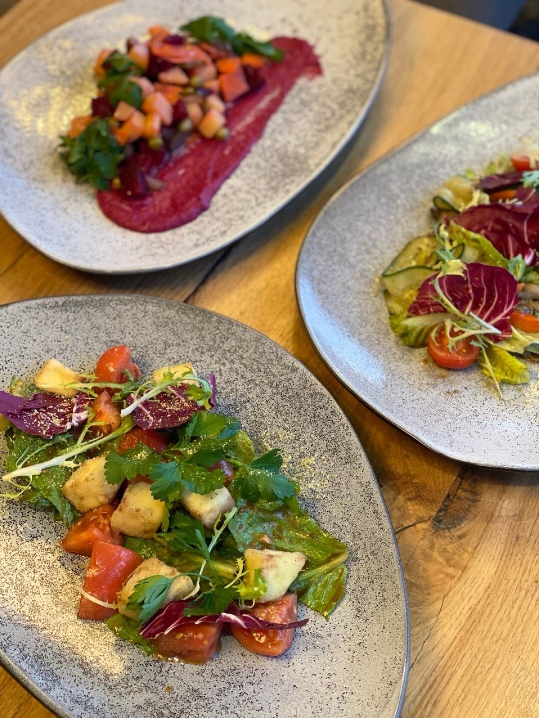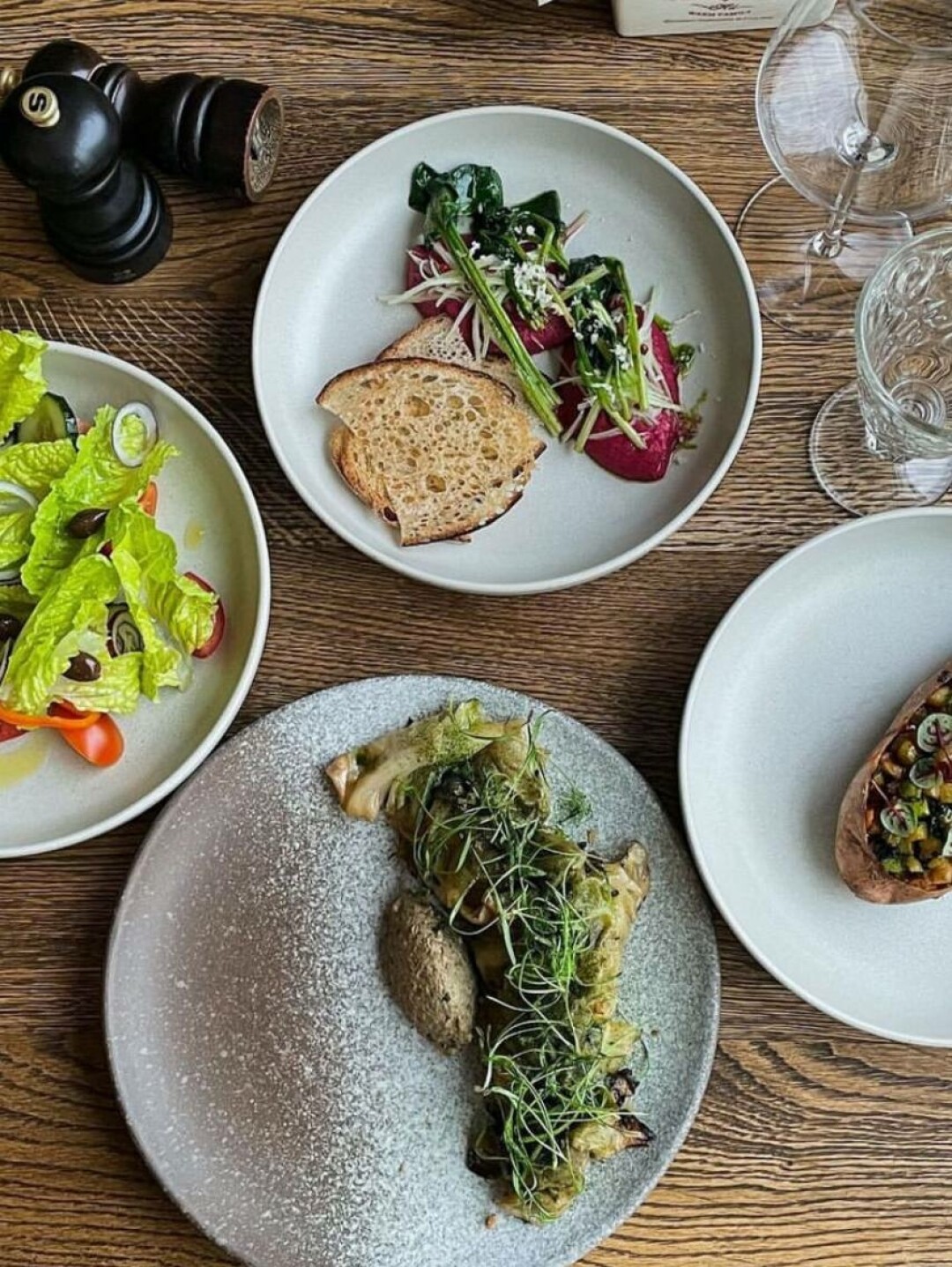 Сытное овощное рагу в печеном батате, свекольный хумус с маринованными сельдереем и пряным шпинатом, тушеная капуста в водорослях комбу с грибной икрой и овощной салат с таджасскими оливками.