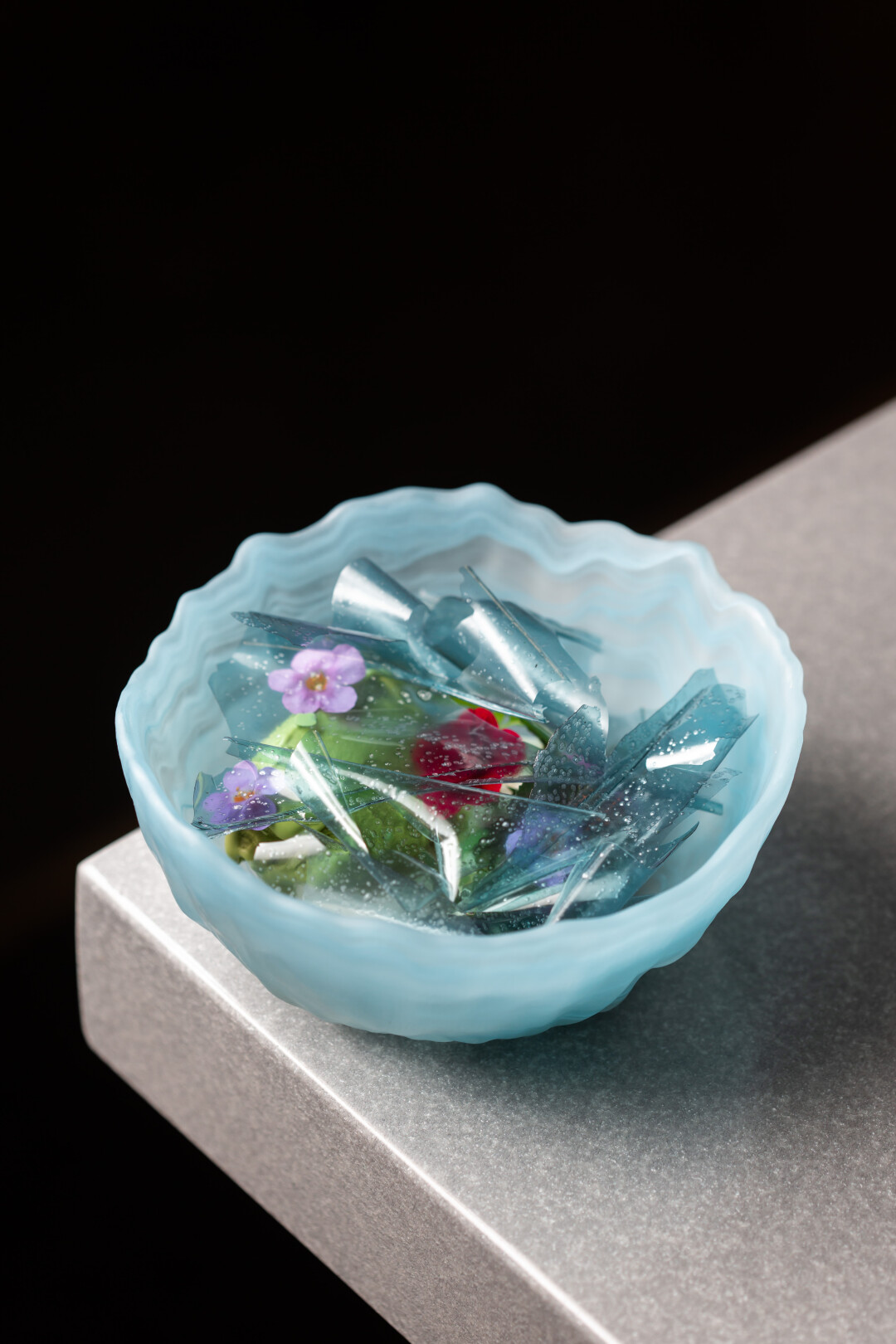 Блеск, наивные детали и прозрачность – и в новых дизайнерских коллекциях, и в этом десерте от ресторана молекулярной кухни. Под имитирующими лед чипсами из цветков анчана скрывается максимально весенняя и свежая композиция: мороженое из сезонного щавеля и листьев лайма с кокосовым кремом. Изящные финальные штрихи блюду придают цветы и микрозелень.