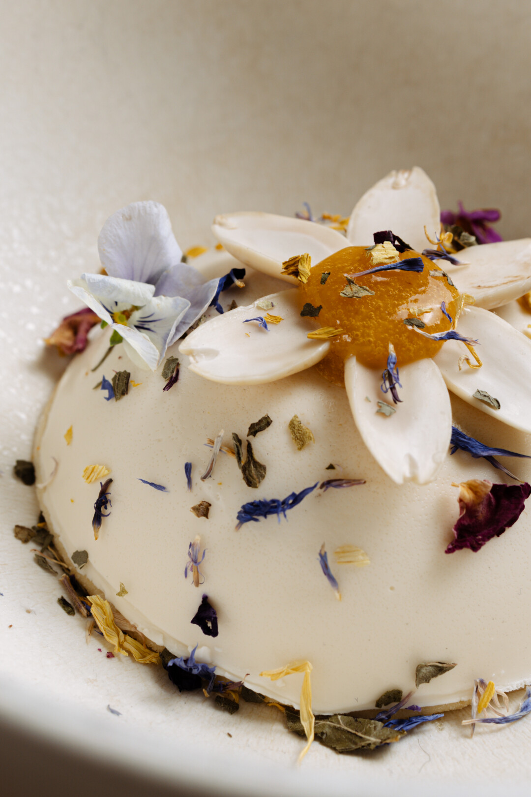 Бланманже органично впишется во все весенние марафоны красоты: в нем используется минимум пшеничной муки и сахара, а также миндальное молоко собственного производства. Десерт сопровождается вареньем из морошки – и снова аллюзии к моде на славиккор с его золотом, массивными украшениями и крупными камнями. А бархатцы в подаче – будто цветочные аппликации на белых юбках Prada из вишлиста любого фэшиониста. Пробовать обязательно, чтобы не отставать от романтичного тренда.