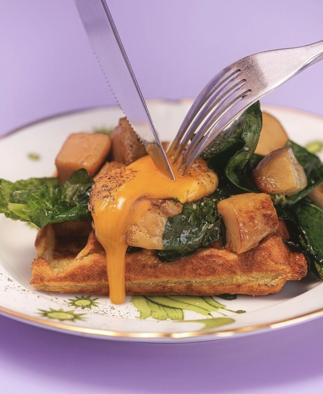 Константин Кленков прощается с летом арбузным сахаром с фетой, инжиром с пряным прошутто и картофельными вафлями с белыми грибами, шпинатом и желтком.