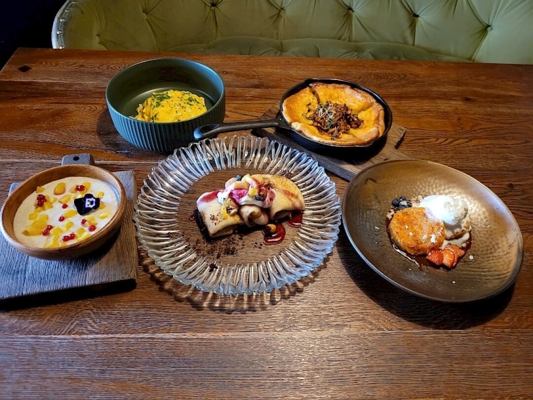Среди участников – «Безухов» и его шеф Александр Голышев. На завтрак до конца ноября тут подают катанку с сомом и крученым омлетом, белевскую кашу с ярмарочными фруктами, мнишки морковные, заварные блины с творогом, орехами и персиком и драчену из русской печи с лисичками.