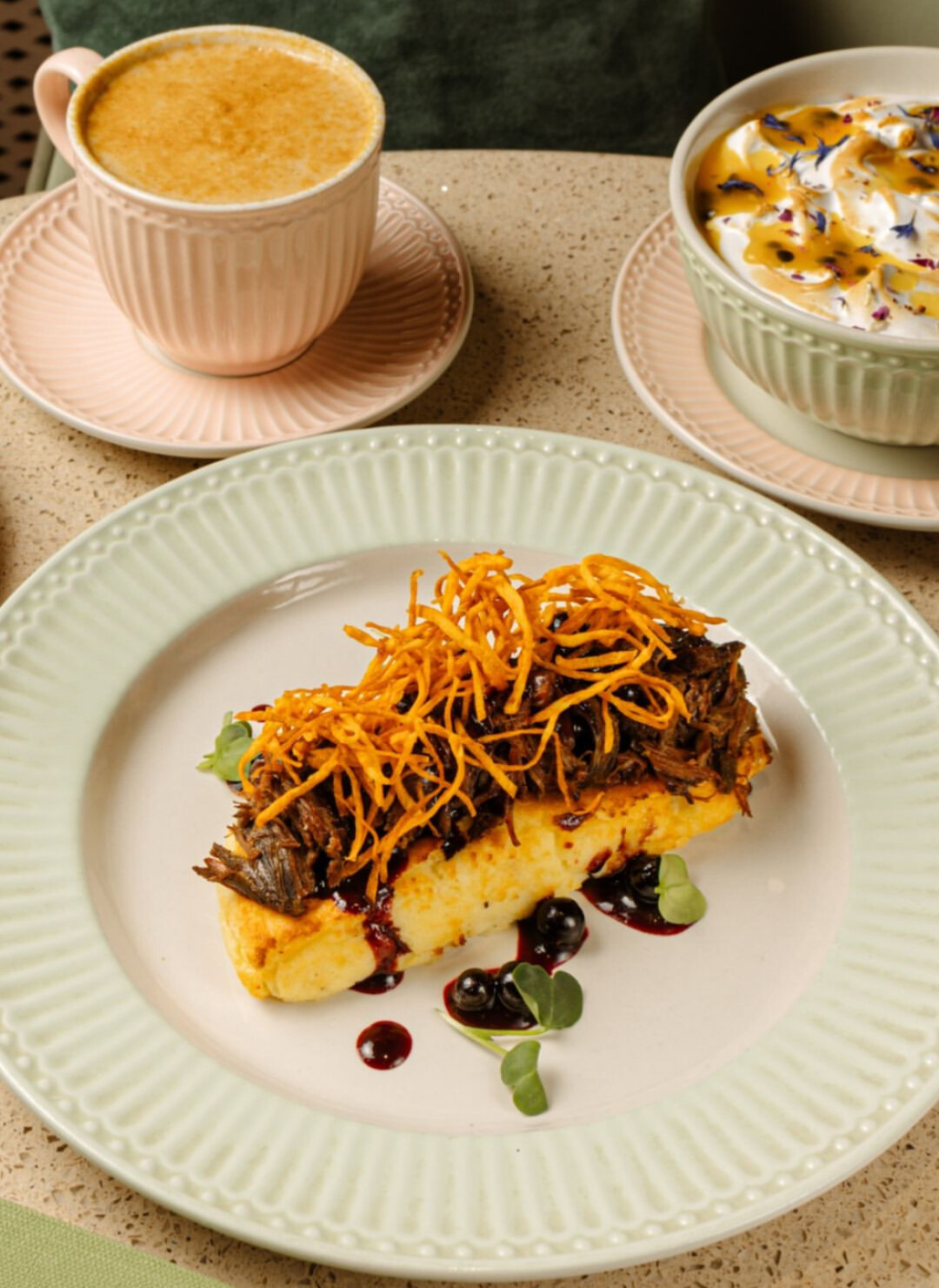 Завтрак с французским акцентом. Самые краши – гранола с фермерским йогуртом и медовой карамелью (350) и французский омлет с грюйером и копченым окороком (550). Все запить черничным латте (360).