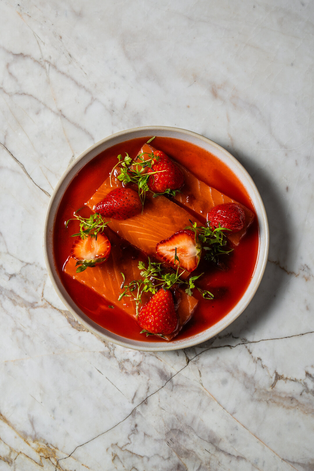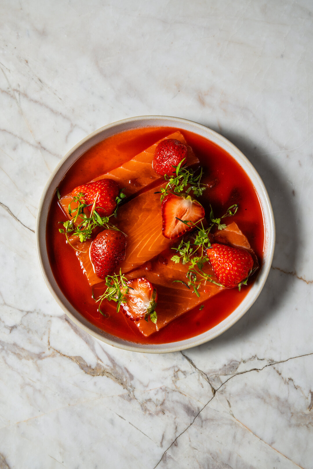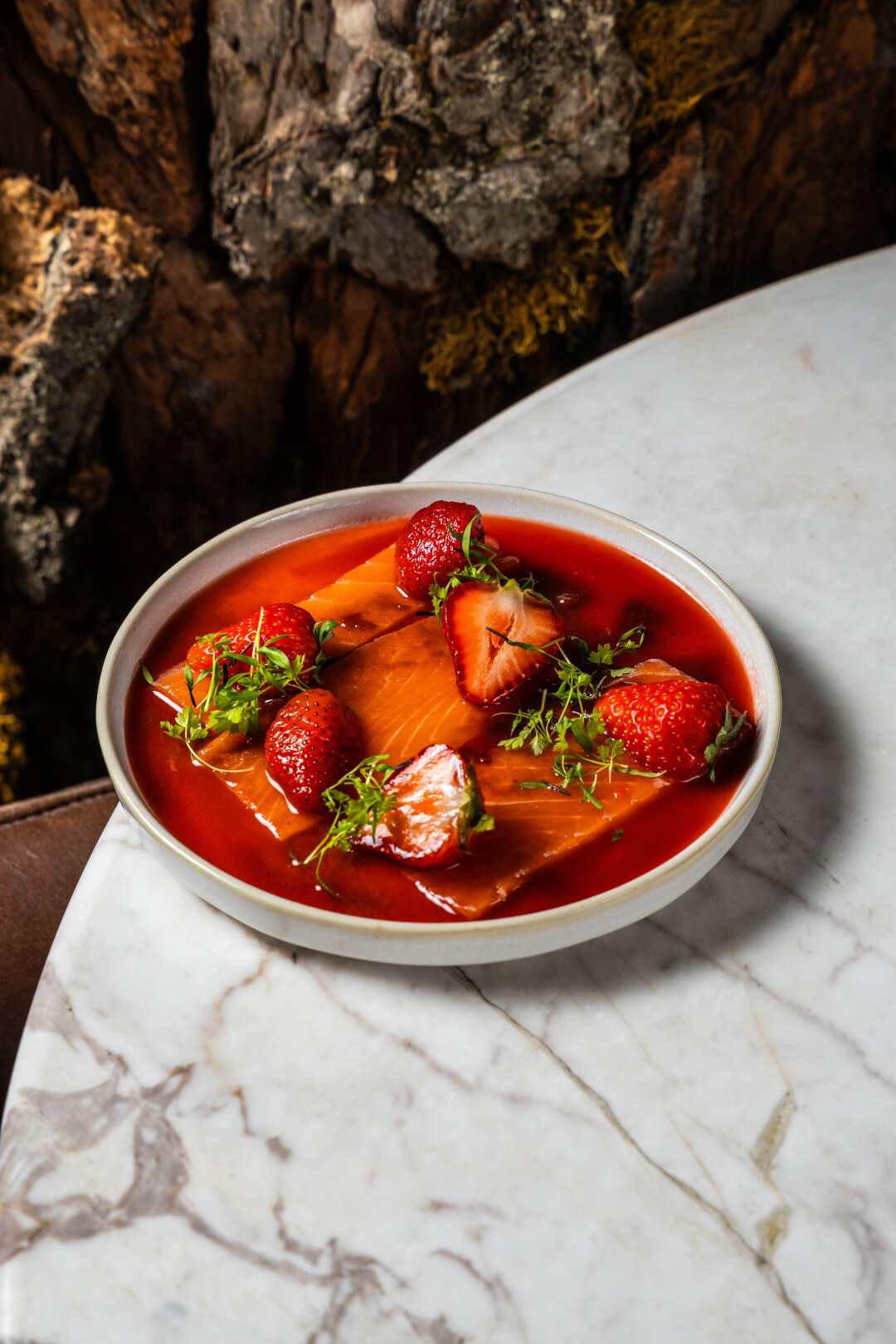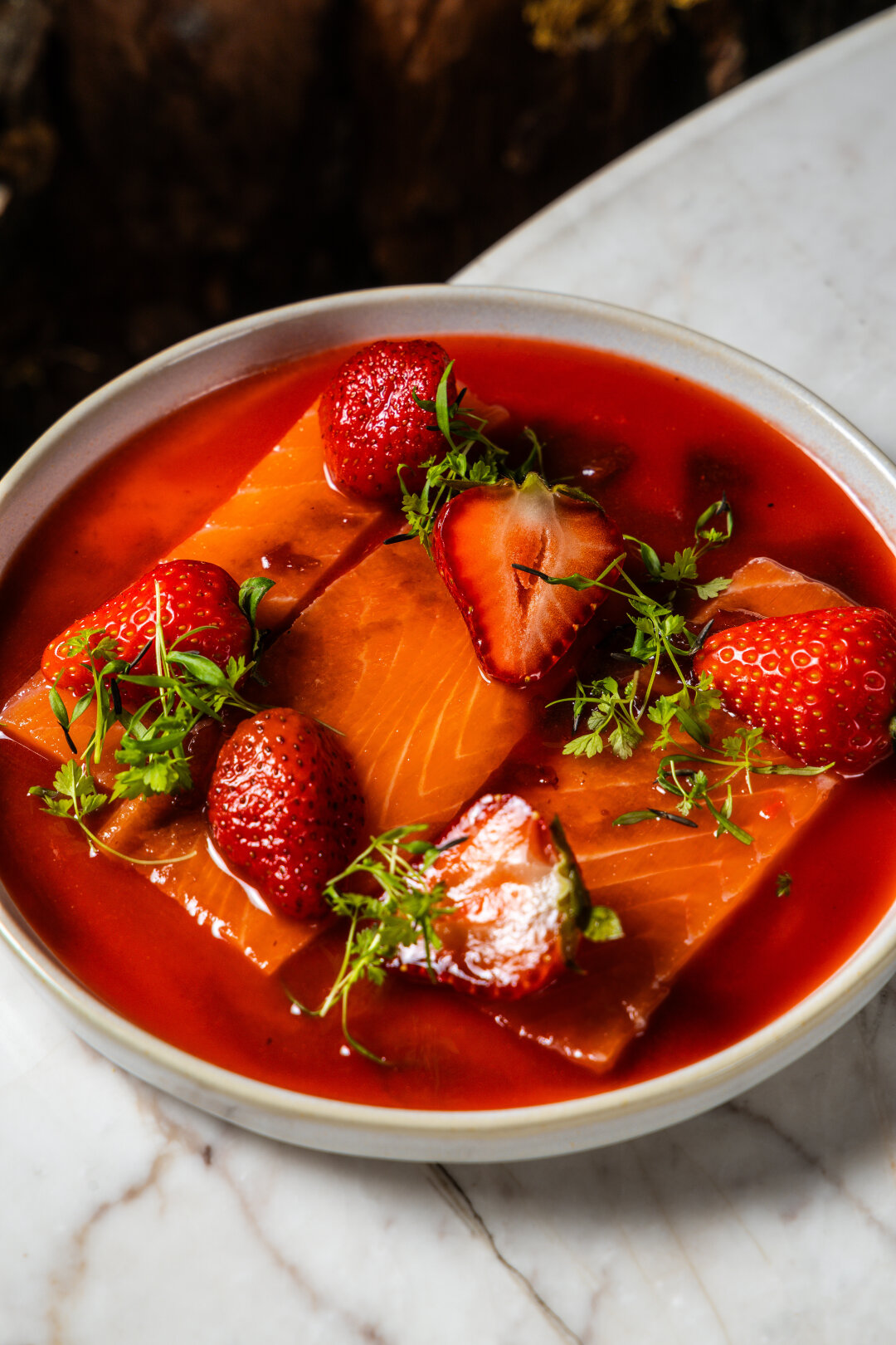 Для тех, кто всерьез собирается по ягоды, у шеф-повара (и гештальт-терапевта!) Ильи Травкина всегда есть клубника даже в декабре, а этим летом – целая клубничная поляна: лосось в RIBS лениво прохлаждается то с клубникой кимчи, то с ремесленным клубничным понзу.