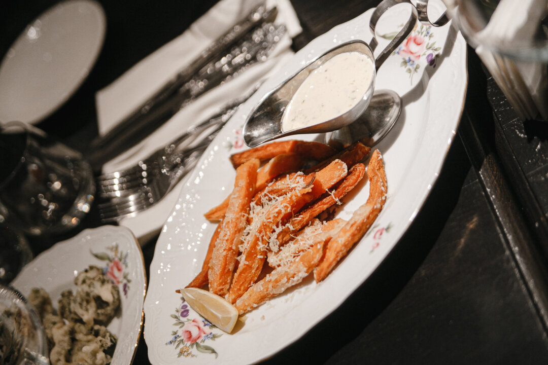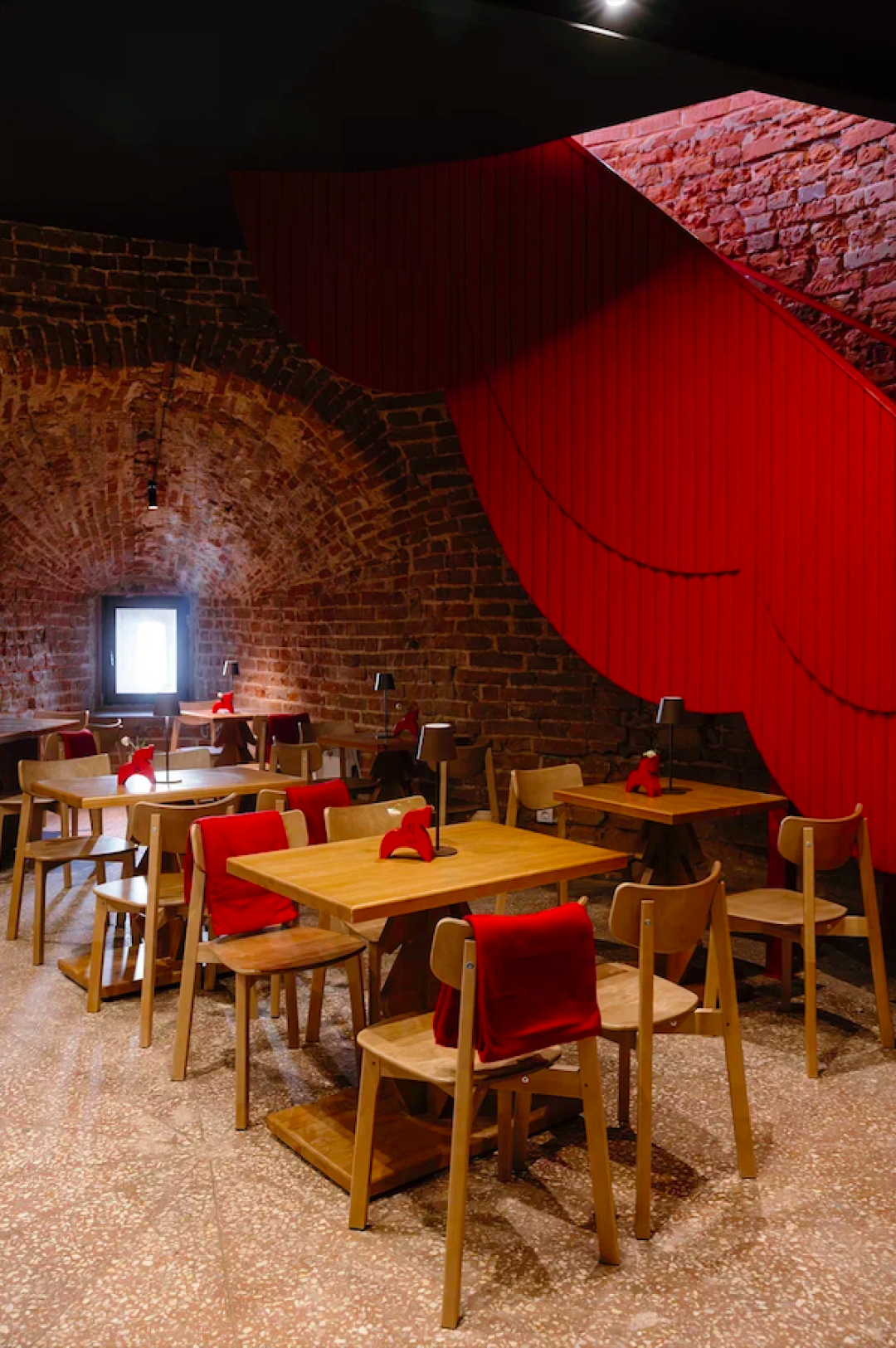 Практически все нижегородские художественные промыслы тщательно переосмыслены и превращены в барный фартук и кружева под потолком и вокруг окон. Из еды: калья, «золотые рыбки» из карасей, оливье с раковыми шейками, томленые утиные сердца и пирожки, как из сказки про Красную шапочку.