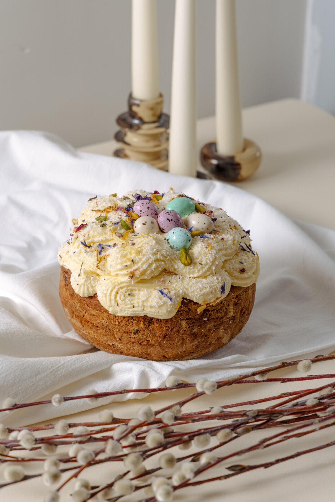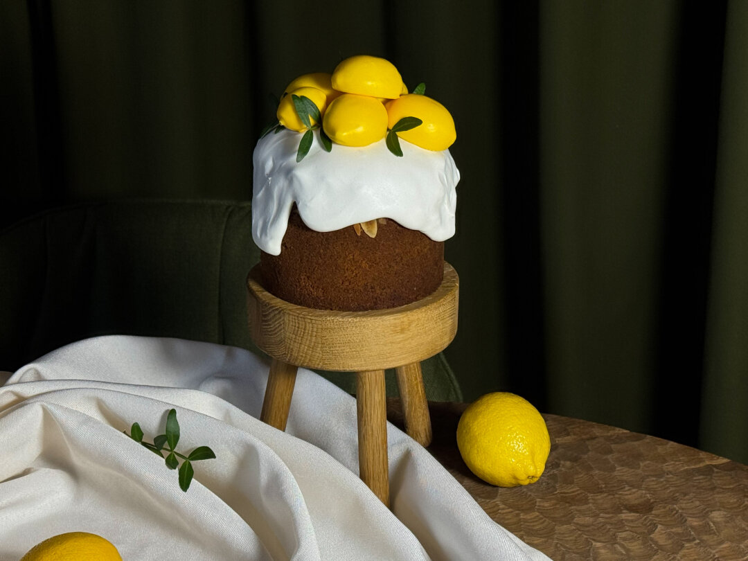«Красивое ничегонеделание» во всей красе. Творожно-миндальный кулич с заварным кремом с ванилью и фисташковой пастой. Сверху – белковая шапка и муссовые мини-лимоны в шоколаде.