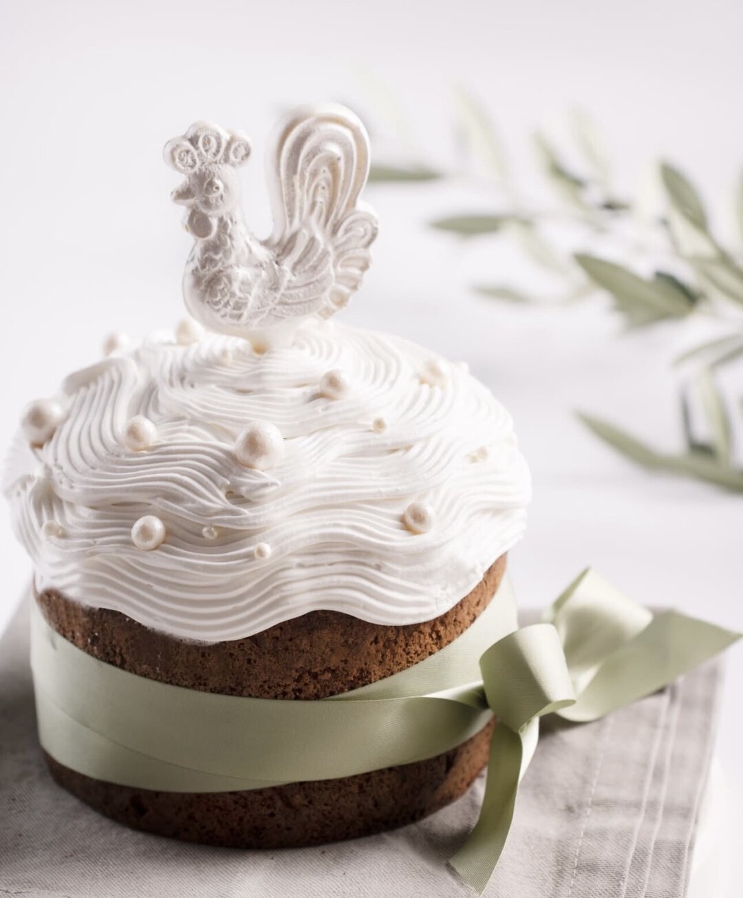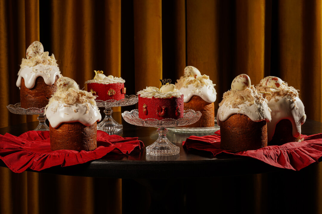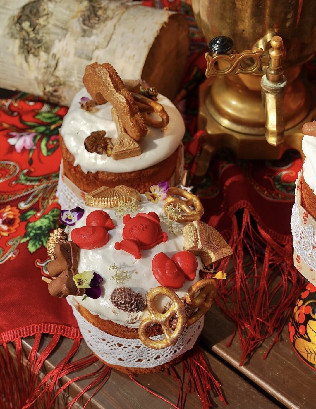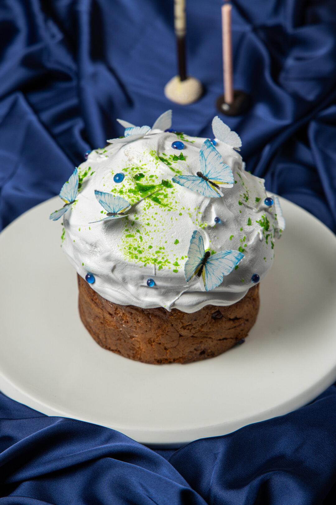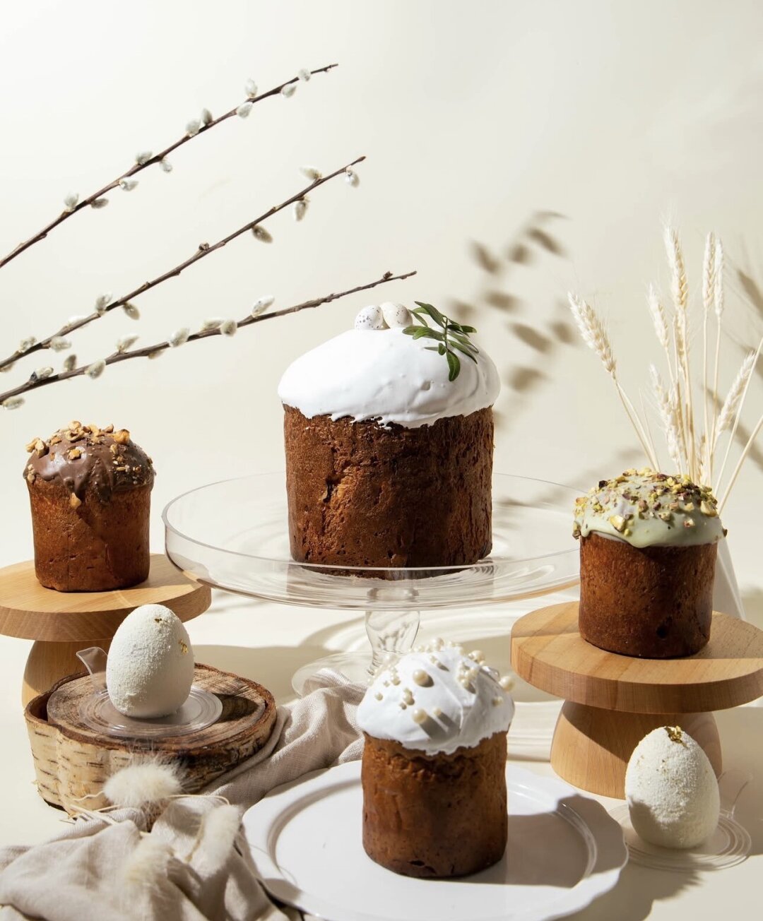 Сразу несколько форматов: тирамису-кулич с эспрессо-пропиткой и кремом, классика с глазурью, клюквой и цедрой, кулич с безе и маршмеллоу, набор из четырех куличей с пропиткой на основе апельсинового сока, украшенные сахарной глазурью, цветами из безе и бабочками из вафельной бумаги.