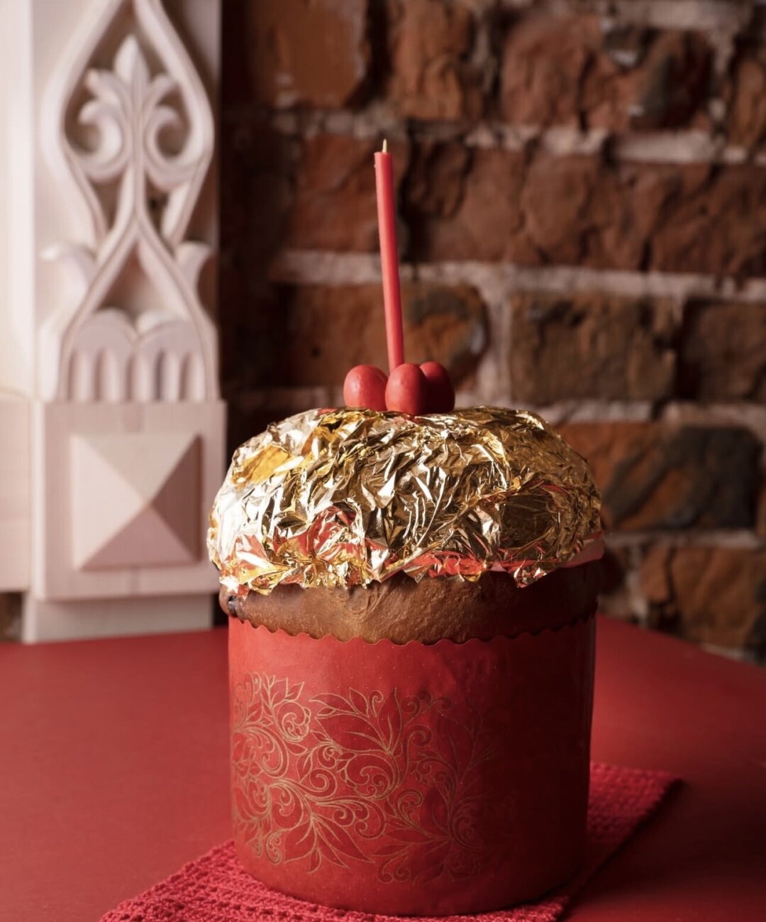 Кулич на закваске с нутеллой, финиками и вяленой брусникой. Украшен меренгой под съедобным сусальным золотом и шоколадными яйцами. Каждый кулич дополняют освященной красной свечой.