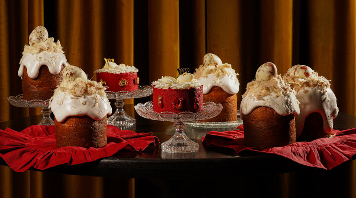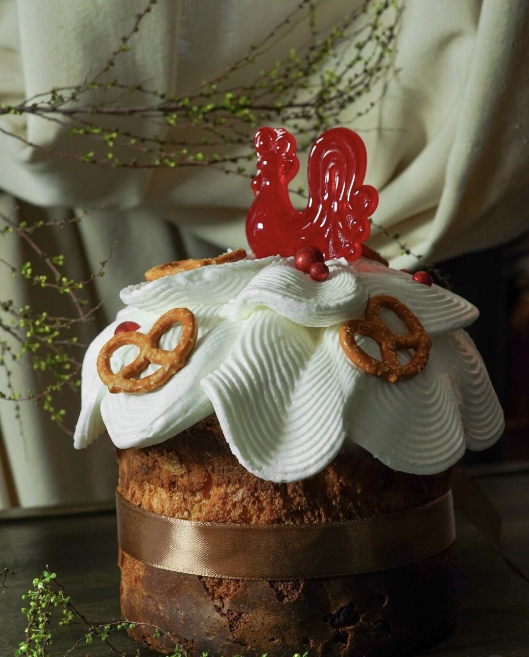 Кулич в разных прочтениях итальянской классики. В Seafood заказываем с цукатами, украшенный сахарной глазурью и бабочками из вафельной бумаги, в Grill берем с леденцовыми петушками и декоративными яйцами из воздушного риса в шоколадной глазури, а в Italy – панеттоне с фисташковой пастой, пеканом, фундуком и сублимированной малиной.