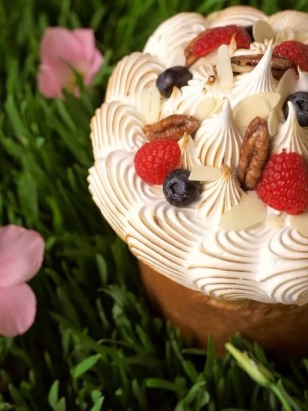 В куличах с ягодами и орехами от Галереи вкуса прекрасно все: нарядная форма из итальянской меренги и миндальных лепестков и нежное содержание с вяленной клюквой и изюмом.