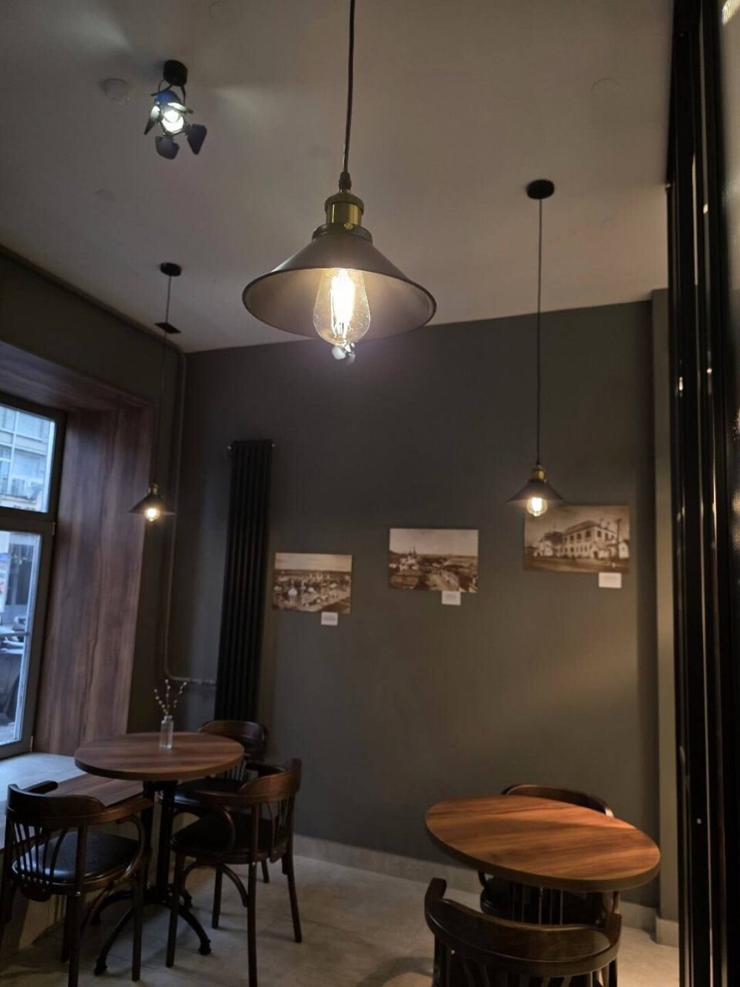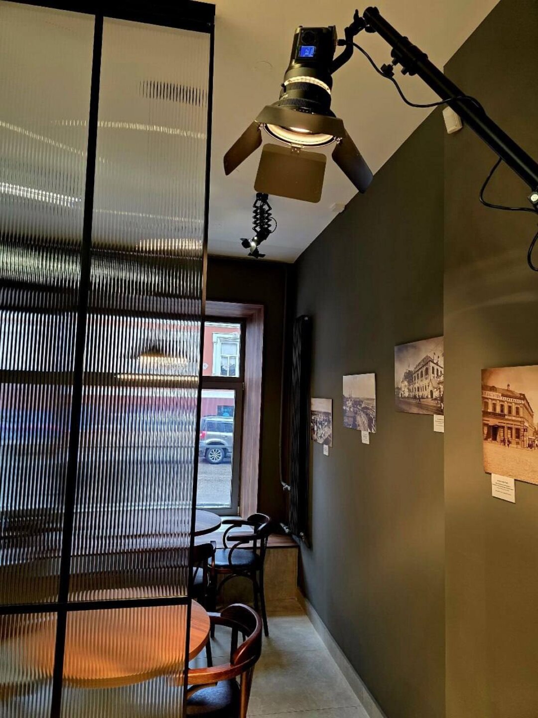 В кофейне подают фильтр с зерном от нижегородского обжарщика, а еще классику на кофемашине. Создатели сделали интерьер «живым архивом» фотографической жизни города: на стенах висят репродукции знаменитых снимков Дмитриева, например, фото Осыпной улицы, снятое на его огромную камеру весом в 100 кг, а в центре зала стоит стеклянная перегородка – прямая отсылка к истории здания.
