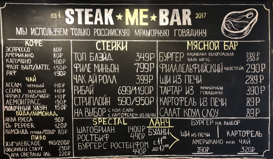 Отбросив все лишнее – пафос, снобизм и завышенные цены, команда делает качественные стейки из российской мраморной говядины в закрытой угольной печи – отечественного же производства. В меню представлены нежный филе миньон и рибай с насыщенным вкусом, стриплойн и даже премиальный шатобриан. Впрочем, бургеры здесь тоже есть: с сочным ростбифом или котлетой блэк ангус. Но начинать знакомство с заведением лучше со знаменитого филадельфийского чиз-стейка: обжаренные с луком мясные слайсы подаются в домашней булочке с большим количеством расплавленного сыра чеддер.