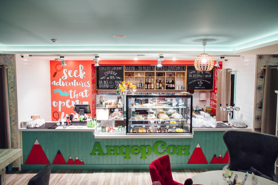 «АндерСон» – это франшиза, но стать их партнером не так просто – не каждый готов принять семейные ценности, да и заставить любить детей невозможно. Мы долго общались с московскими партнерами, несколько раз встречались, прежде чем выбрать формат заведения – концепции всех «АндерСонов» разные. Мне по духу была близка идея путешествий, поэтому в нашем кафе стены цвета морской волны, и полочки-лодочки соседствуют с чемоданами, веслами, путевыми указателями и парящими под потолком самолетами. У нас есть и книжки из домашней библиотеки, и журналы про путешествия, и игрушки. Это целое семейное пространство.