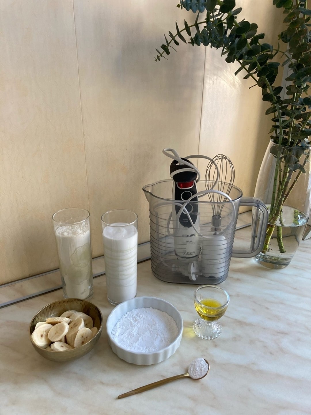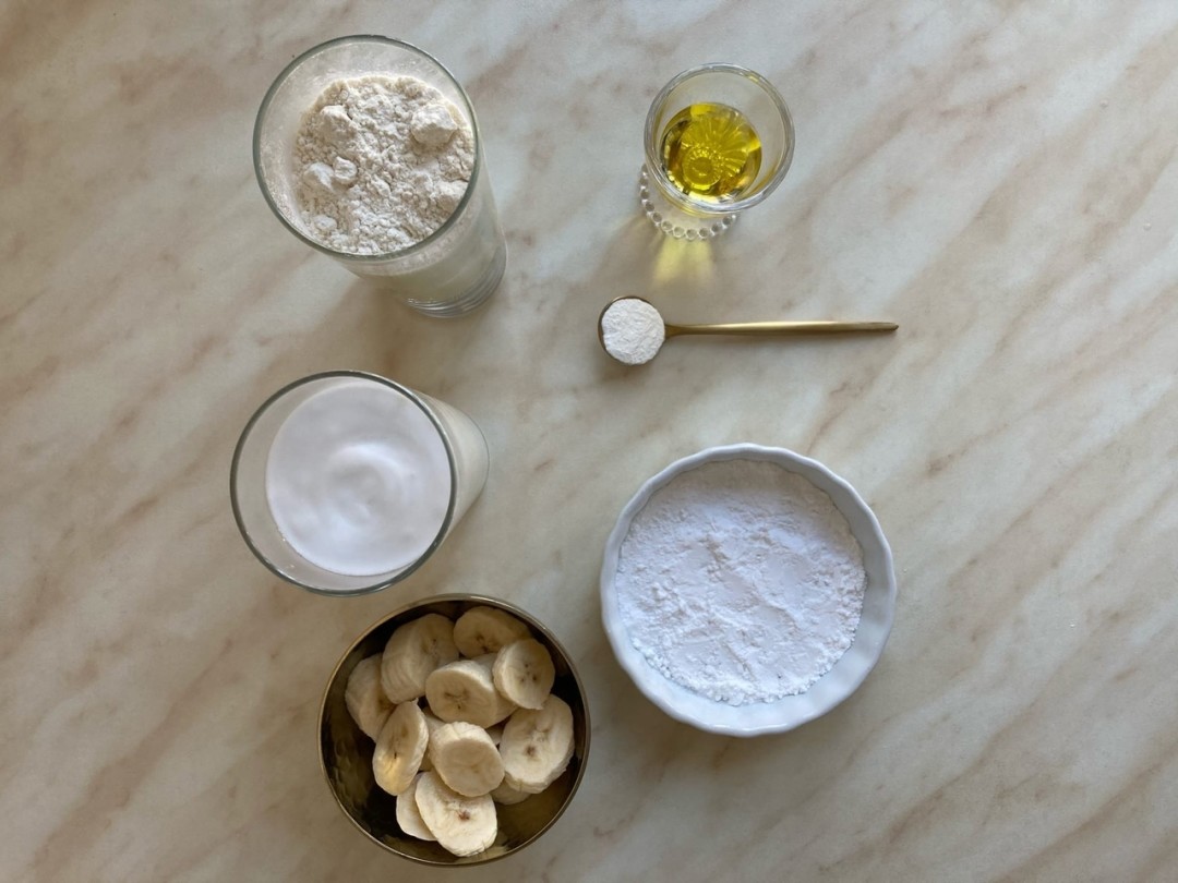 Соединяем 250 мл кокосового молока, муку, сахарную пудру, разрыхлитель, банан и оливковое масло. Тщательно взбиваем в блендере до однородной консистенции и выпекаем на смазанной оливковом маслом сковороде.