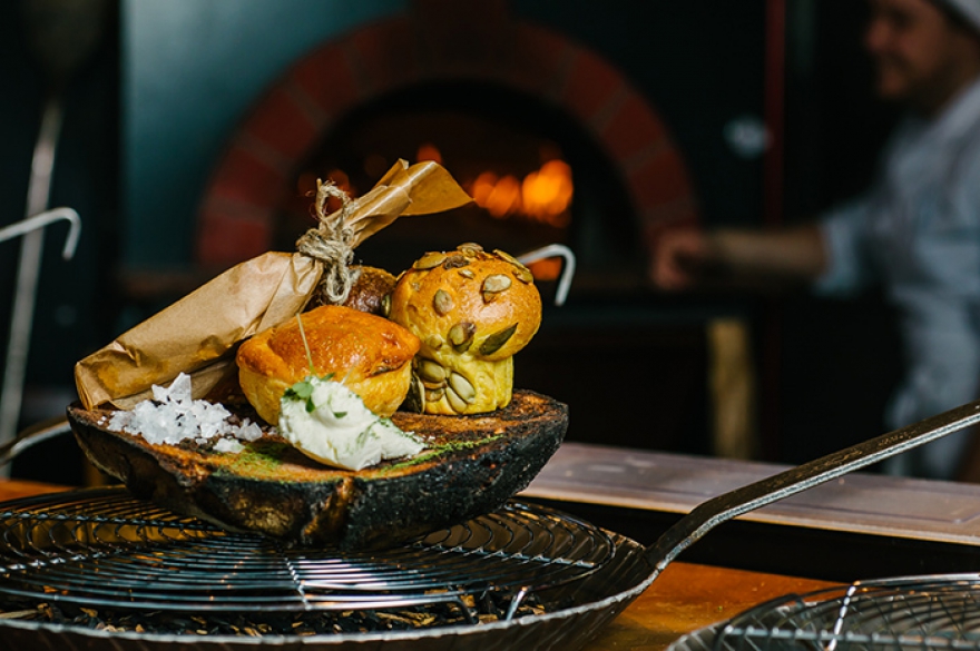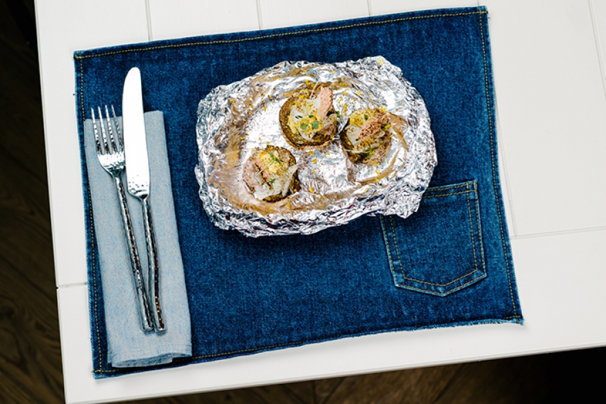 Второй, декоративный подход к подаче — про «во первых, это красиво». Например, для брускетты с крабом я сделал тарелки из фольги — они переливаются в вечернем освещении. Мнешь фольгу, помещаешь ее в пакет, высасываешь воздух вакуумной машиной. Она так сильно прессуется, что образуется твердая, но живая в пластике поверхность. Ее себестоимость — ноль, а выглядит она на миллион. Для брускетты с печенью цыпленка я брутальный спил дерева обил металлом. В панорамной «Гастрономике» насмотрелся на заплатки крыш и молотком выколотил из меди как бы состарившийся под дождем лист — на нем мы подаем бургер. Сначала я сам изготавливаю образец, потом его воспроизводят технические службы. Сейчас у меня на кухне как в мастерской: гвозди, молотки, своего часа ждет металлическая проволока. Так было не всегда. Точно помню, что начал свои эксперименты только пять лет назад, во время выезда в Башкирию на кейтеринг для сорока человек. Нас — двое поваров, заготовщиков нет, кухня обычная. Гостей оказалось почти сотня, так что пришлось своими руками расширять посудный фонд. Паштеты выносили на прокаленных яичных клетках, хлеб — на сухом лаваше.