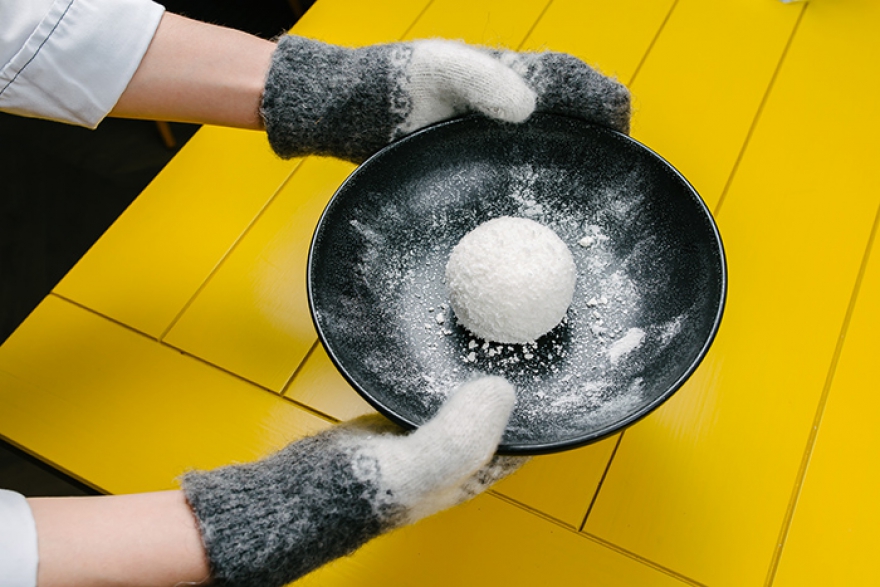 У каждого блюда кроме классической есть два варианта подачи: логическая и декоративная. Первая строит ассоциации, которые помогут лучше прочувствовать еду. Беломорский рыбный суп на сене и опилках — вот он, только что из котелка рыбаков. Жареные пельмешки на замятой газете, как я выкладывал в пабе Brugge, — это же наш национальный стритфуд, его нужно есть как закуску, из кулька. Газета, конечно, специальная: свой выпуск мы печатали на пищевой бумаге. Яйцо и сосиски сами дожариваются над раскаленной солью перед гостями, так мы делали в гастропабе Bruxelles, чтобы напомнить о барбекю с мангалом. Даже милые акценты нужно расставлять правильно: тарелку с кокосовым сорбетом вынести в варежках, подчеркнув его сходство со снежком, под манго на колотом льду положить включенный завакуумированный фонарик, что сделает блюдо похожим на ледник. Гости могут не бояться, что продукты без привычной посуды— это негигиенично. Каждый объект, если он живой, нужно подвергнуть тепловой обработке либо обезопасить. Например, морские камни для строганины из нерки лежат целый день под проточной водой, потом мы их кипятим и только после этого на них работаем.