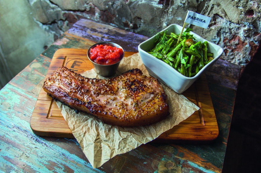 В разделе «Бранч» блюда, которые традиционно подходят для завтрака – блинчики, каши, сырники, омлеты – мы предлагаем гостям в любое время суток. Потому что утро у каждого начинается в свое время. Недавно разработали новое предложение для компаний. Это три пати-сета: на дуэт, квартет и секстет. Каждый сет подается на большой доске, на которую выложены различные закуски: хрустящие роллы с мясом и лососем, овощи, гренки с паштетом и сыром, колбаски, куриные крылья, соусы. У нас на кухне стоит угольный гриль, поэтому многие блюда готовятся на нем, в том числе ингредиенты теплых салатов – розовый тунец, цыпленок. Ну и конечно гриль – главный герой при создании бургеров. Котлеты мы делаем из мраморной говядины, а хлеб сами выпекаем в печи. Очень рекомендую попробовать наш фирменный бургер Fabrika с сочной котлетой, маринованным перчиком халапенью, беконом, глазуньей и сыром чеддер. Бургер подается на деревянной доске в сопровождении картофеля фри в колоритном пергаментном кульке и соуса в металлическом ведерке. Все просто и понятно». |