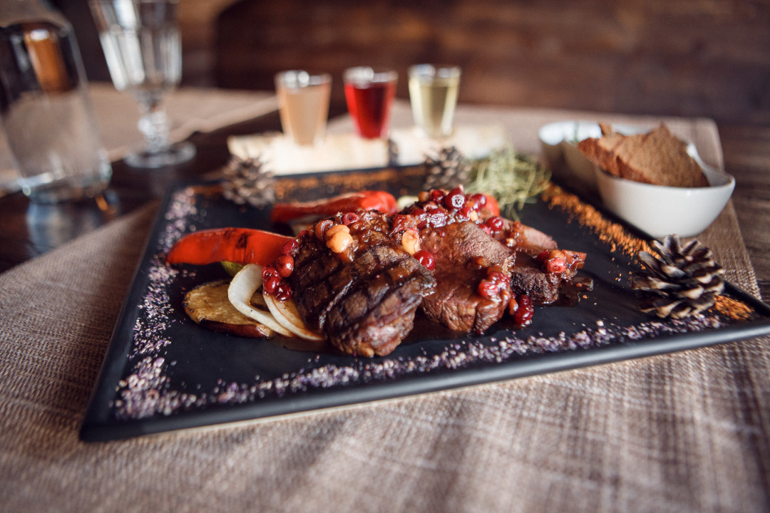 Меню у нас разнообразное и сбалансированное: в нем есть салаты с копченой грудкой фазана или оливье с чавычей и раковыми шейками, дикий северный муксун и мякоть косули с гарниром из томленой гречи. Мир дичи богат и разнообразен, с естественными вкусами можно играть бесконечно, а никакие ароматизаторы, усилители вкуса и агрессивные специи мы не используем принципиально. Для любителей сладкого мы предлагаем широкий выбор любимых десертов, домашнего варенья и сорбетов.