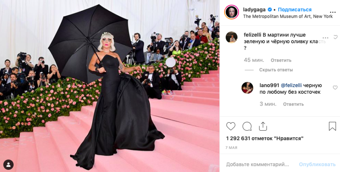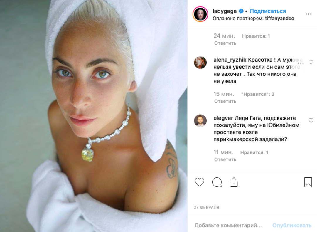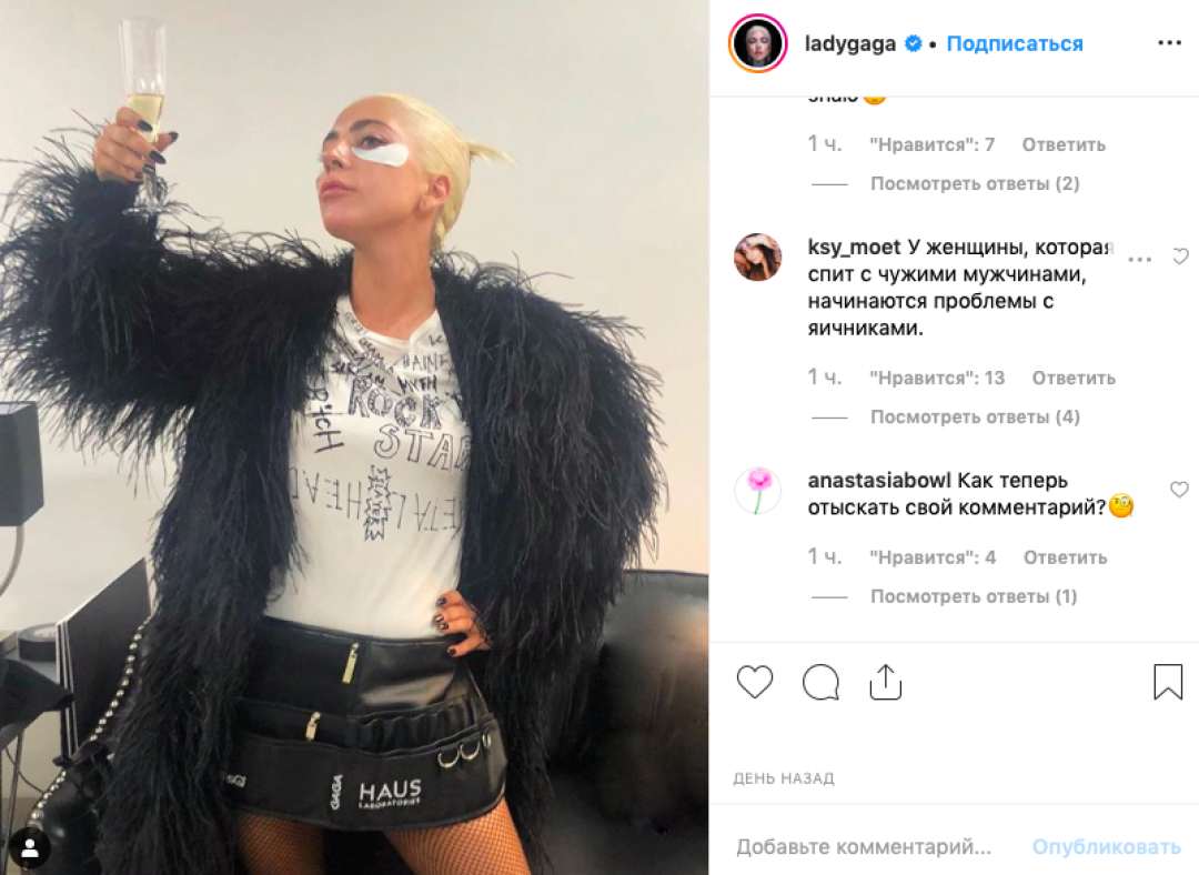 После того, как американские таблоиды рассказали о возможных отношениях исполнителей главных ролей в фильме «Звезда родилась» Леди Гаги и Брэдли Купера, инстаграм певицы превратился в чат «Одноклассников». Русские подписчики обвиняют Гагу в том, что она «увела мужа» у русской модели Ирины Шейк и пишут ей оскорбительные (и даже проклинающие!) комментарии. Впрочем, этим дело не ограничивается: под постами певицы люди также цитируют гимн России, ищут своих земляков из Магнитогорска, советуют забирать вместо Купера Евгения Петросяна, сдают квартиры, продают фермы и даже оставляют рецепты блюд. «Собака.ru» публикует некоторые из них, сохраняя орфографию и пунктуацию авторов.