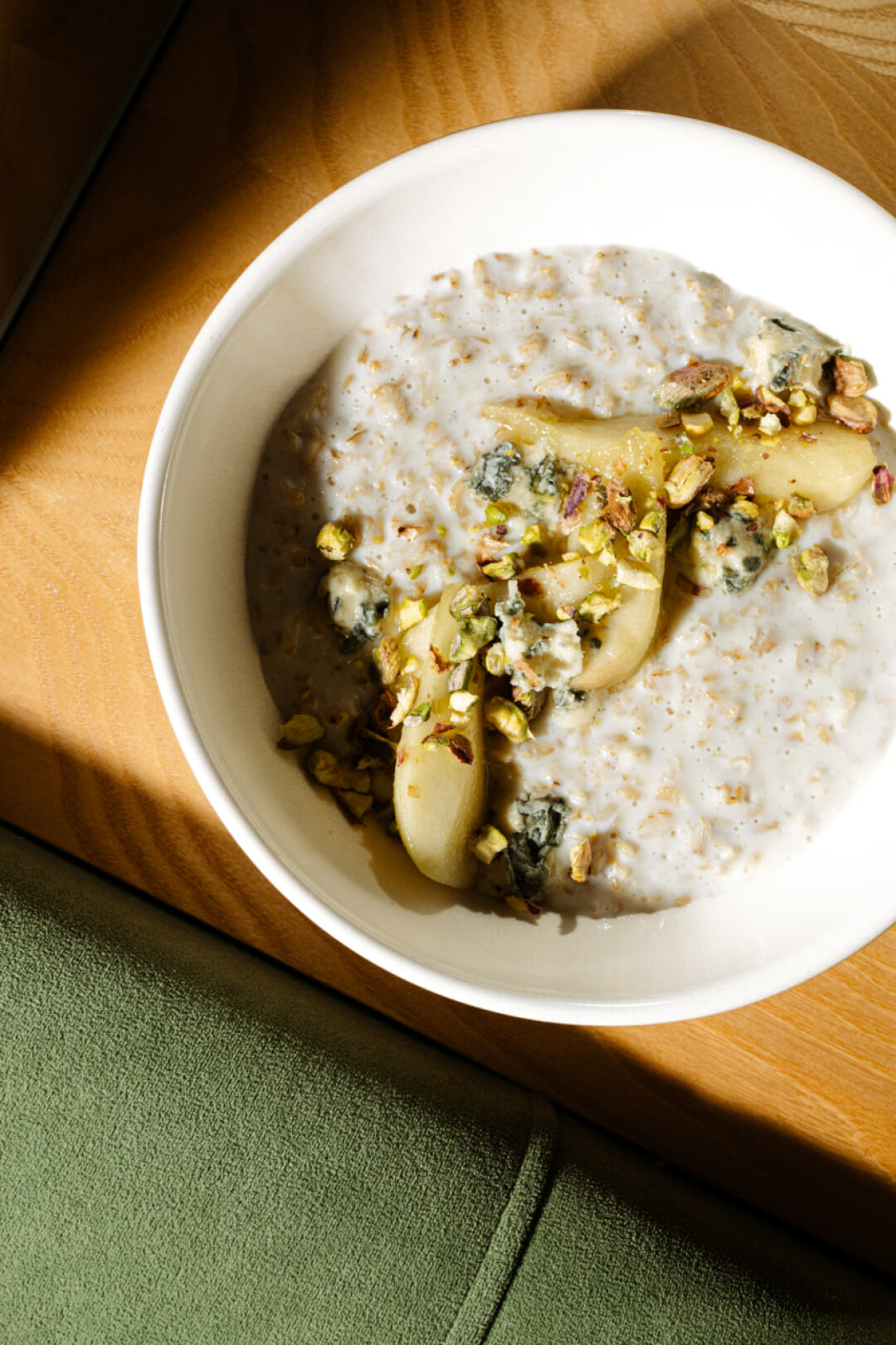 Овсяная каша с грушей в карамели, голубым сыром и фисташками