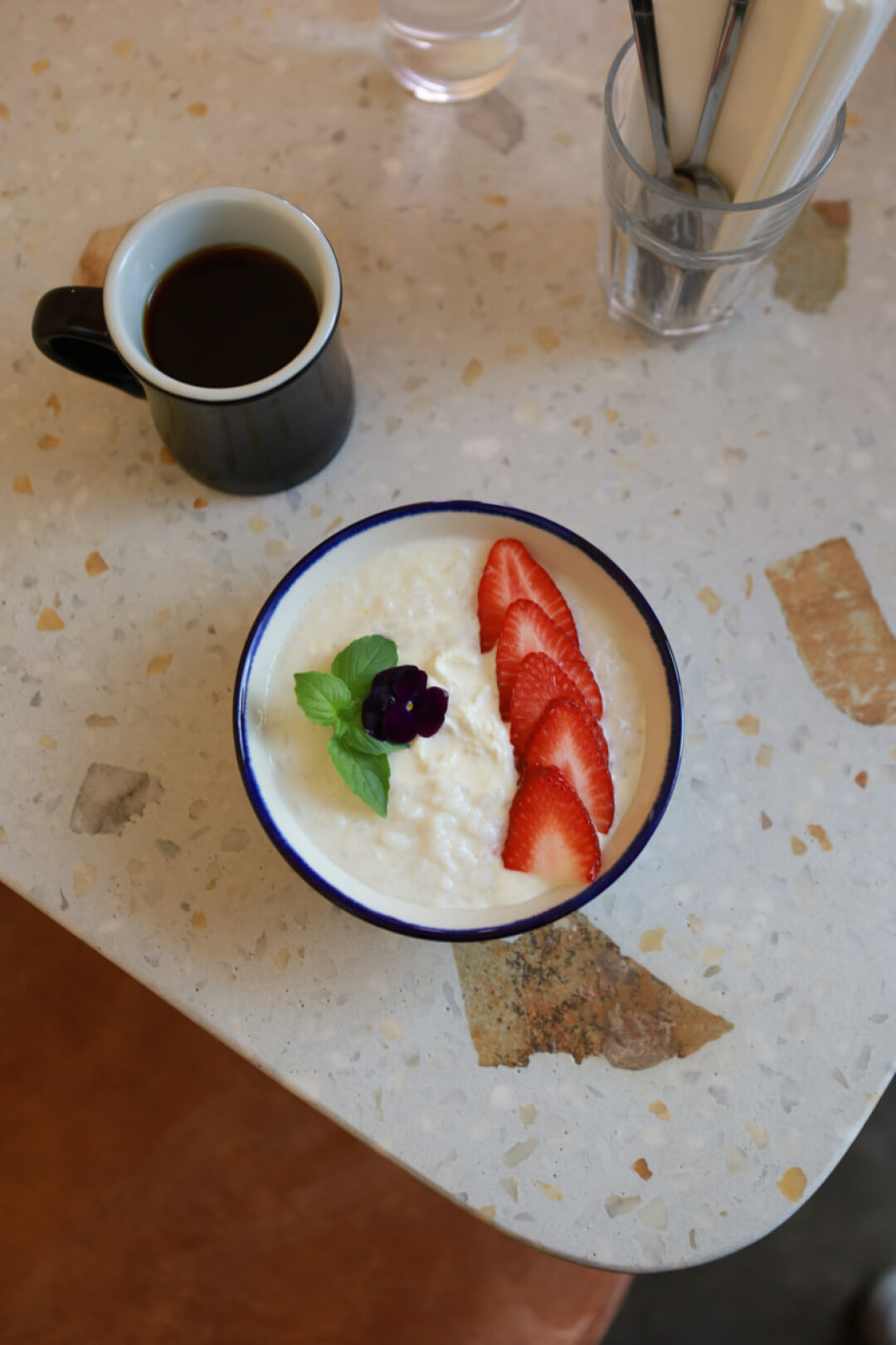 «Верхушка кофе» все кормит нас завтраками. Каша, конечно, царица здешнего брекфаста: рисовая, на кокосовом молоке с клубникой и страчателлой. Берем к ней сезонный «Какао Пряный чили» или авторский «Раф брауни», например.