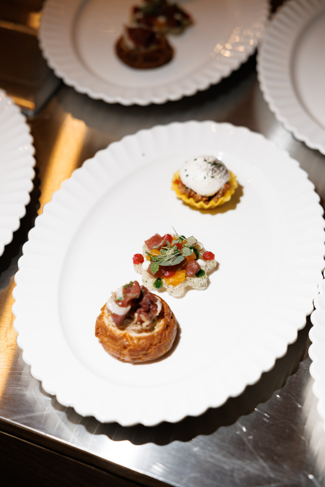 Курс от каждого из шефов – в авторском стиле, отражал философию его кухни и ресторана. Начали под игристое с яркого амисбуша (трио от приглашенных шефов) – хамона из утки, хрустящего цветочка (или «мишленовской звезды», по определению Александра Николаенко) с тунцом, томатом, пармезаном и брусникой и пшеничной тарталетки с тартаром из утиной грудки.