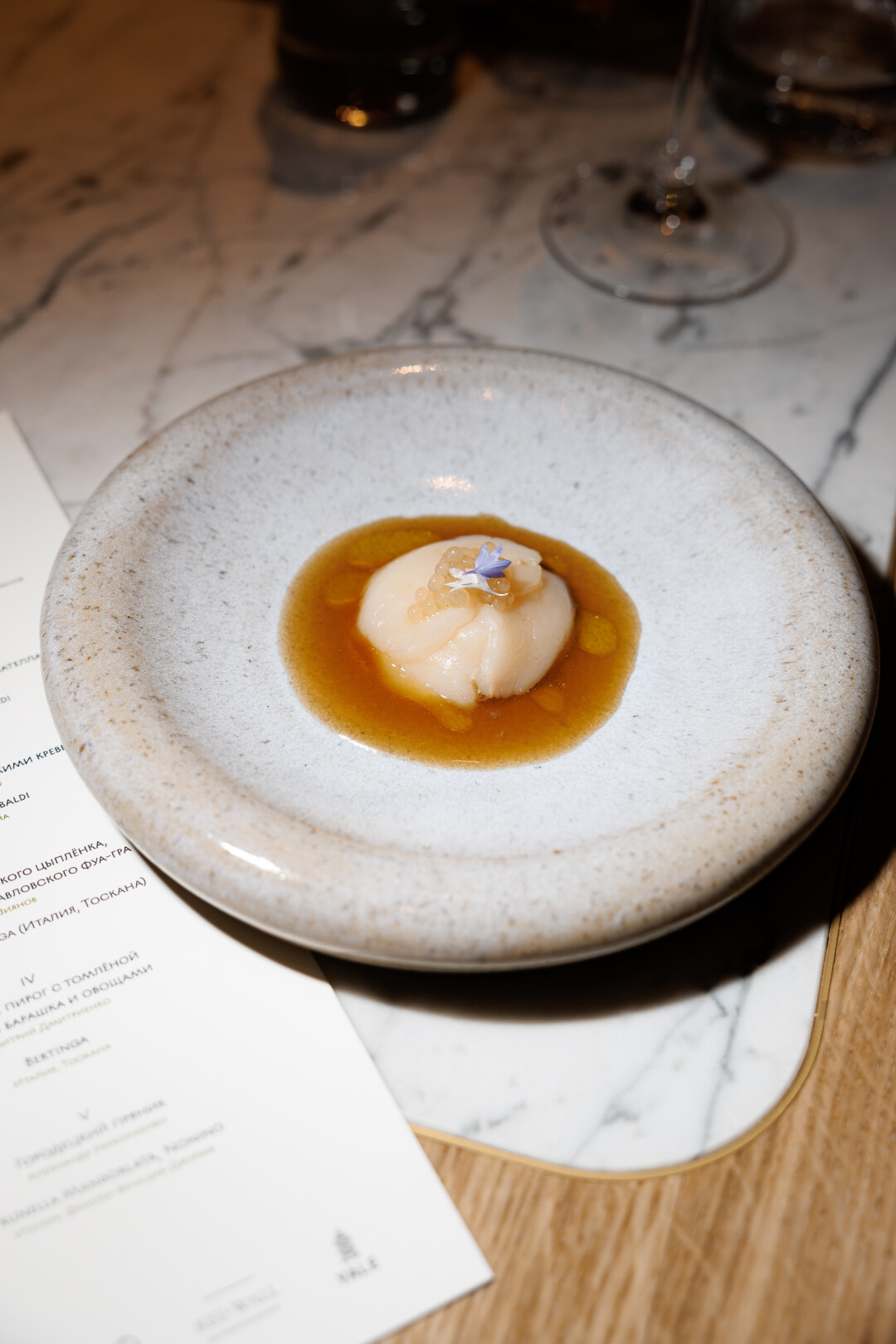 Второе блюдо (от Олега Колисниченко) – крудо из дальневосточного гребешка и нижегородская страчателла. Необычное сочетание оттенили цитрусовые ноты соуса из водорослей, а усилила вкус морепродукта икра из устриц.