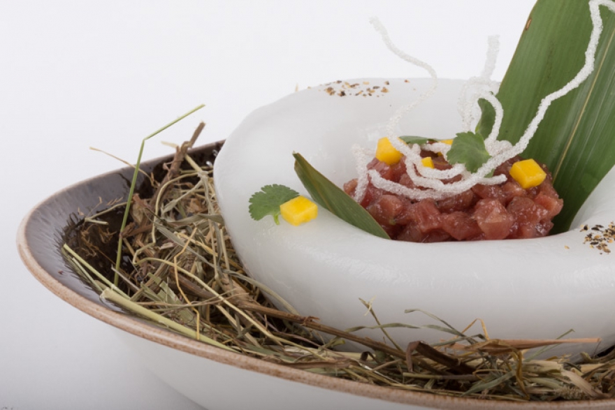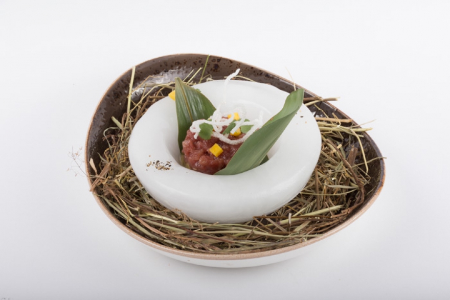 Формат подачи навеян сменой сезонов. Зима ушла, растаял снег, кое-где появились прогалины с прошлогодней травой, а где-то еще остались ледяные островки. Эти образы нашли отражение в подаче блюда: тар-тар выкладывается в ледяную тарелку, которая размещается на небольшом пучке настоящего сена. Единение с природой – модный кулинарный тренд.