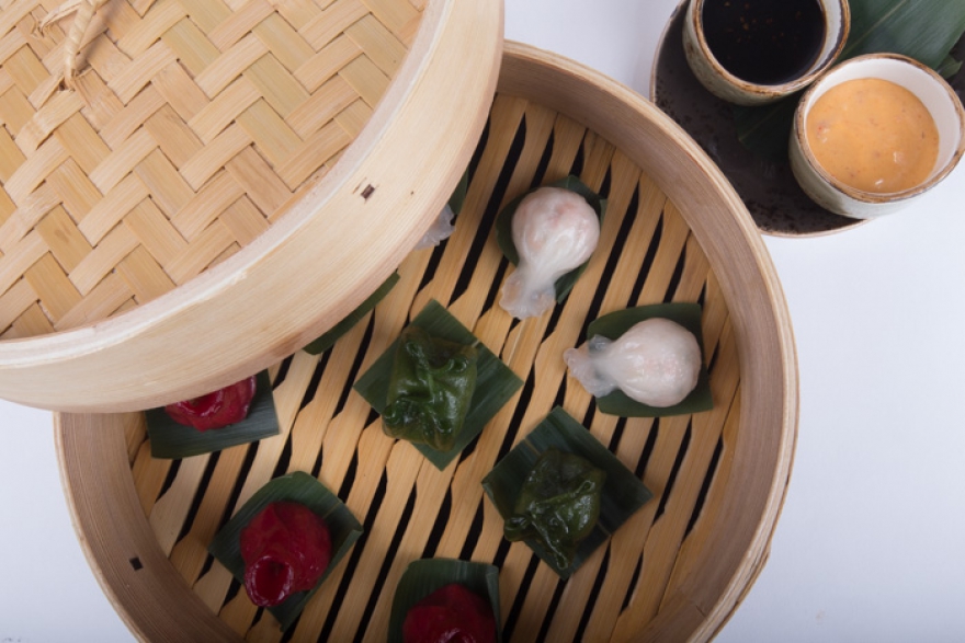 Приготовленные из особого заварного теста китайские дим самы на самом деле очень отдаленно напоминают свой русский аналог. Легкая закуска подается в трех вариациях: розовые – с поросенком и овощами, зеленые – с курицей и черными древесными грибами муэр, и традиционные белые с креветками.