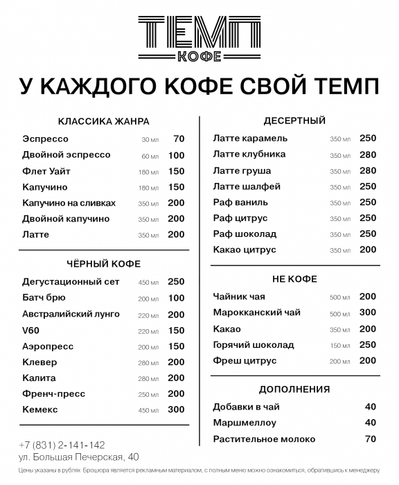 Ценовая политика "Темпа", в целом, не сильно отличается от цен других кофеен третьей волны, формируя средний чек в размере 400 рублей за два напитка. Если подходить к вопросу с точки зрения восприятия кофе как нового культа и знать весь смысловой бэкграунд напитка, то такую сумму можно назвать приемлемой. Однако, по сравнению с кофейнями, где варят исключительно классику, стоимость некоторых позиций в меню сложно назвать демократичной.