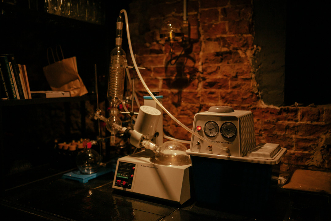 Аппарат для создания барной ароматики называется «вакуумный ротационный испаритель». Мы берем нейтральную спиртовую основу, мешаем ее, например, с лемонграссом, смесь заливаем в колбу и выставляем нужную температуру. Перегонка происходит при отрицательном давлении в вакууме. Получается, что мы не варим жидкость, а перегоняем, испарения уходят, и на выходе мы получаем конденсат. При этом сохраняется исходное качество продукта — аромат, свежесть того самого лемонграсса.