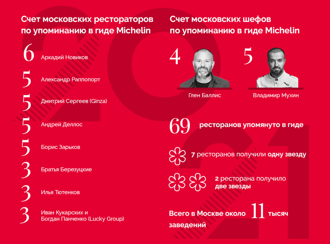 Если взять и проанализировать весь гид, то можно увидеть очень интересную статистику: всего упомянуто в гиде 69 ресторанов, из них 26 косвенно входят в состав ведущих ресторанных групп Москвы. Например, если абстрагироваться от звезд и категорий то первое место по количеству упоминаний все-таки у Аркадия Новикова, когда у Андрея Деллоса, Александра Раппопорта, Бориса Зарькова и Дмитрия Сергеева (который косвенно продюссирует многие московские проекты) равное количество отметок в гиде.