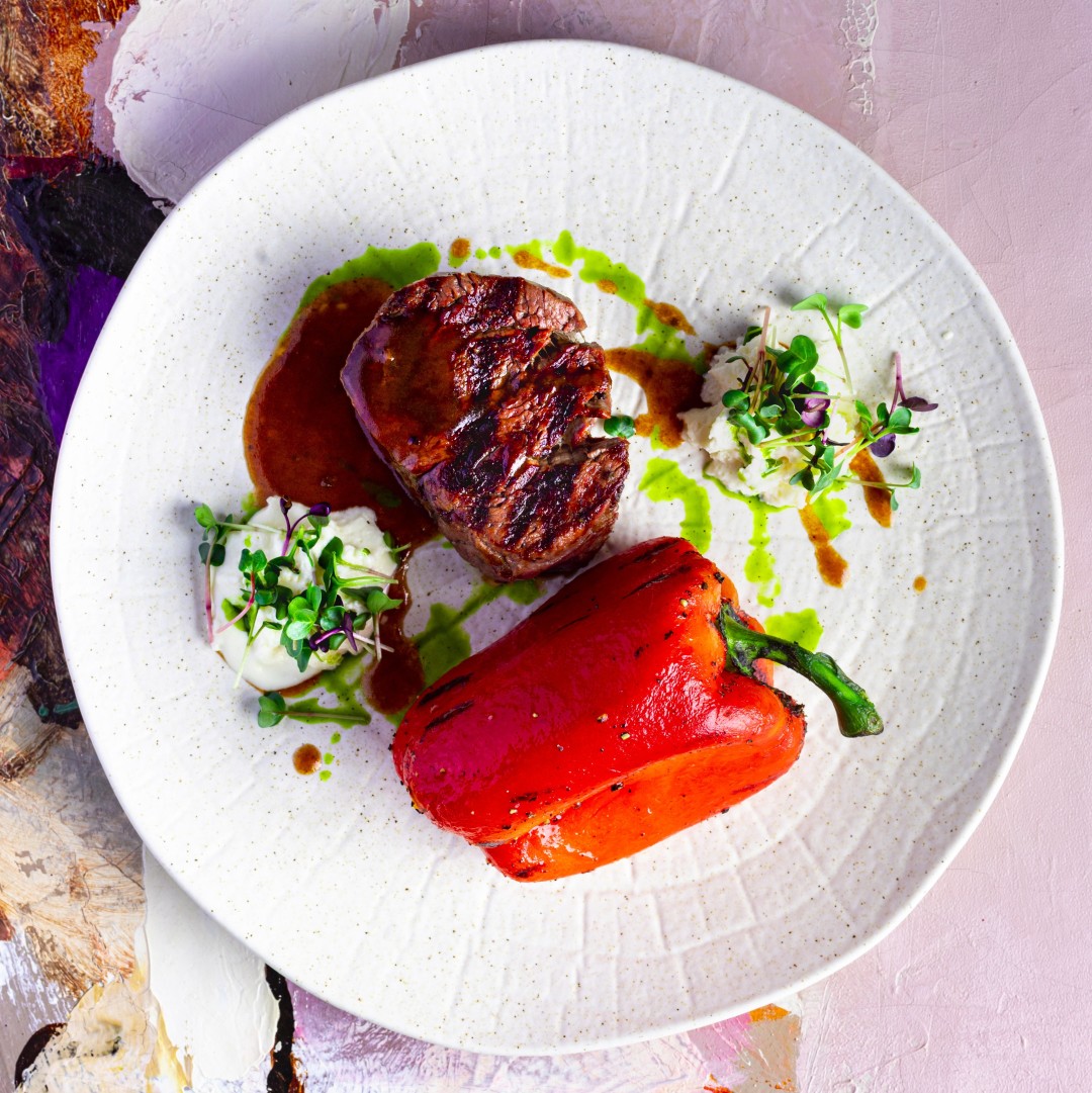 Блюдо, внешним видом напоминающее палитру художника: огненно-красное пятно печеного сладкого перца здесь соседствует с карамельным цветом стейка. «Примиряет» эту борьбу цветовых противоположностей нежная страчателла. В каких пропорциях смешать эти три «краски» – решать гостю, но мы подсказываем: все равно получится одинаково хорошо.