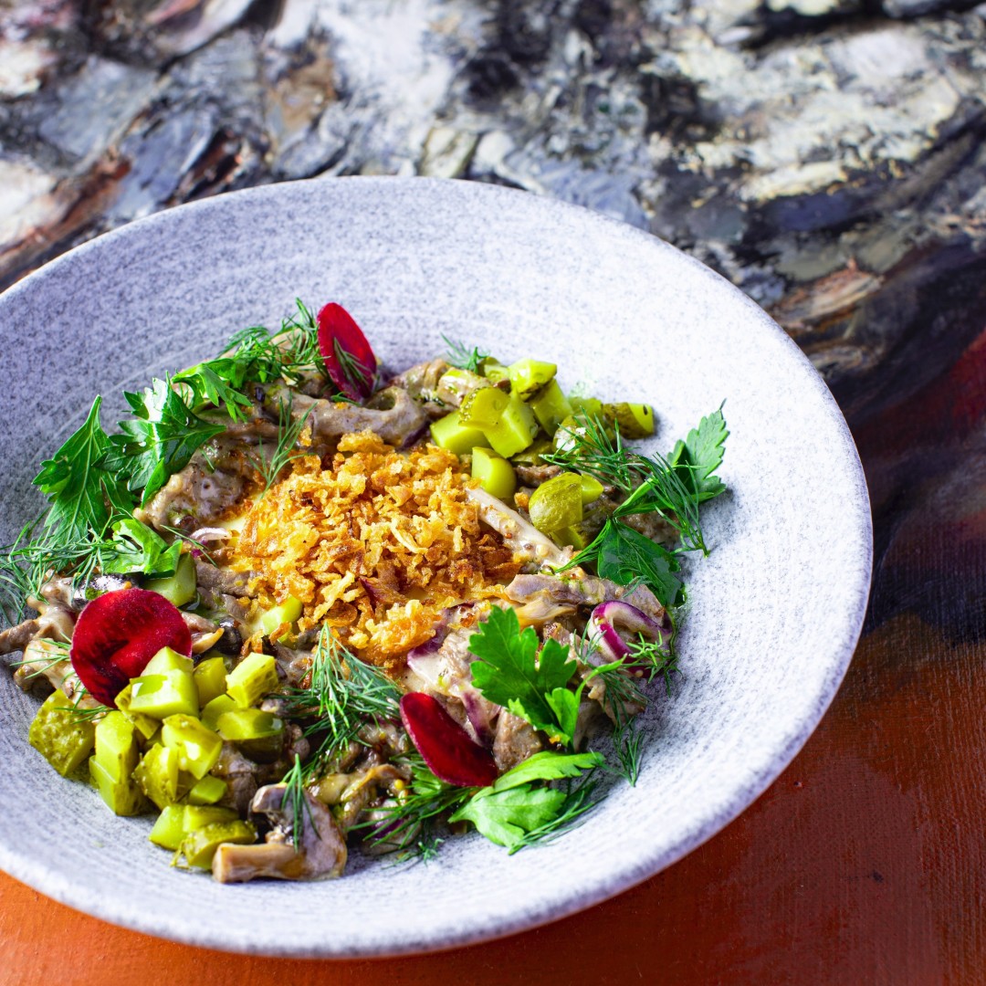Блюдо-шарада, в котором скрываются главные вкусы русской кухни. Нежное мясо и сливочный соус, маринованные огурцы и лесные грибы, свежая зелень и лук – разгадывать эту загадку можно снова и снова.