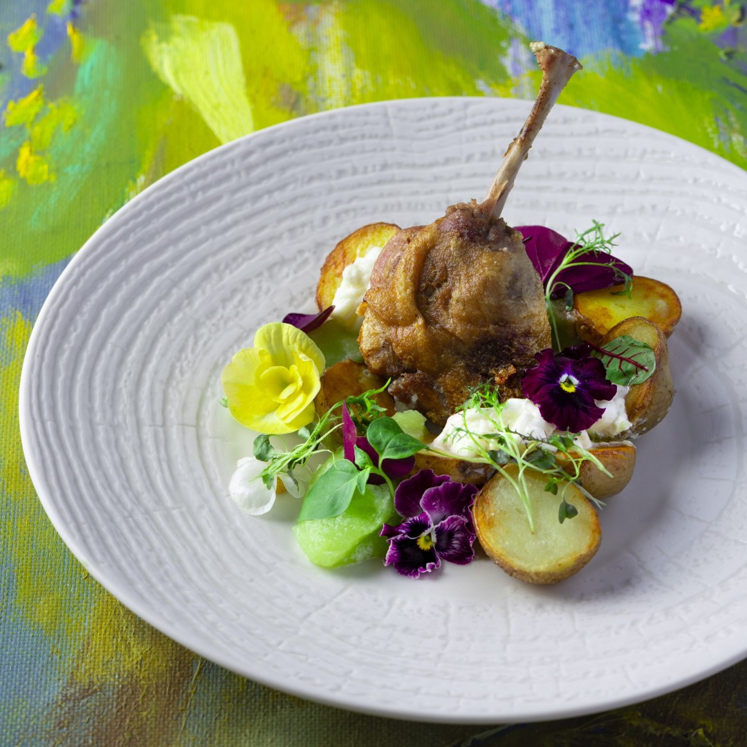Утиная ножка с копченой страчателлой, яблочным пюре и картофелем