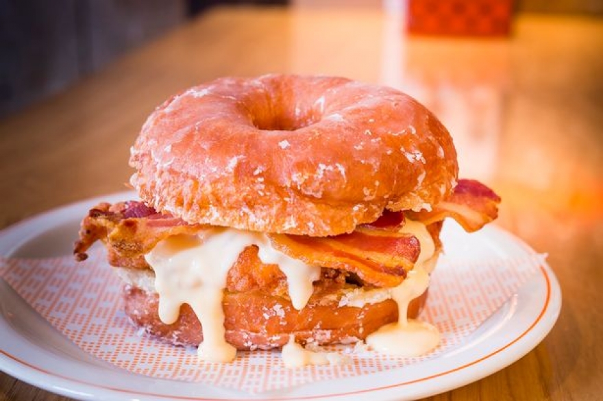 Обычный гамбургер, который поместили между двумя глазированными пончиками. Очень понравится тем, кто любит мясо и сладкое — не придется заказывать дополнительный десерт. Подают такое лакомство практически во всех бургерных Европы и США.