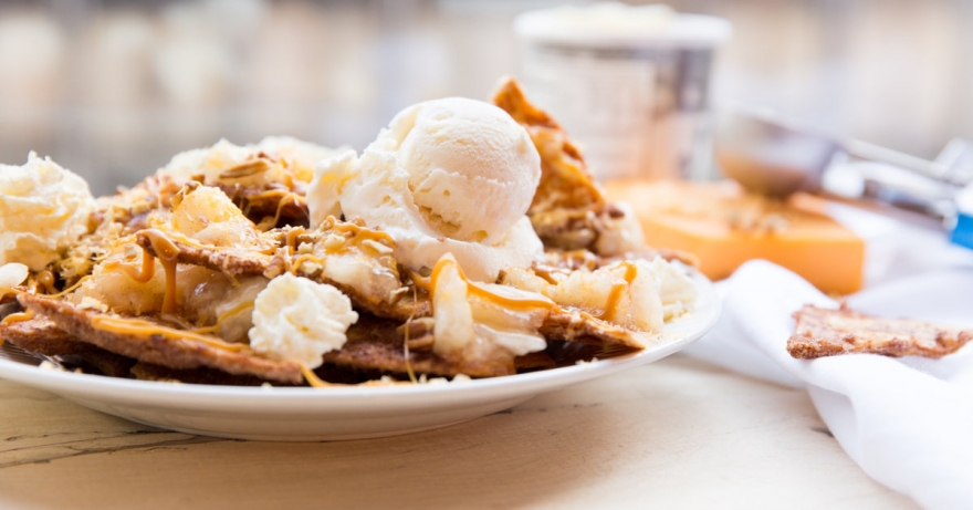 Груда кукурузных чипсов, покрытая сверху классическим яблочным пирогом и политая карамелью, взбитыми сливками и сырным соусом (потому что начос).