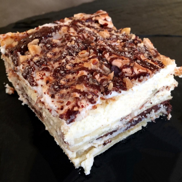 Смесь теста для лазаньи, сладкого заварного крема для канноли, ганаша из нутеллы, жареных орехов, посыпанная жареными грибами. Придумали этот десерт на родине лазаньи, в Италии.