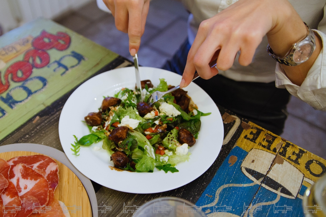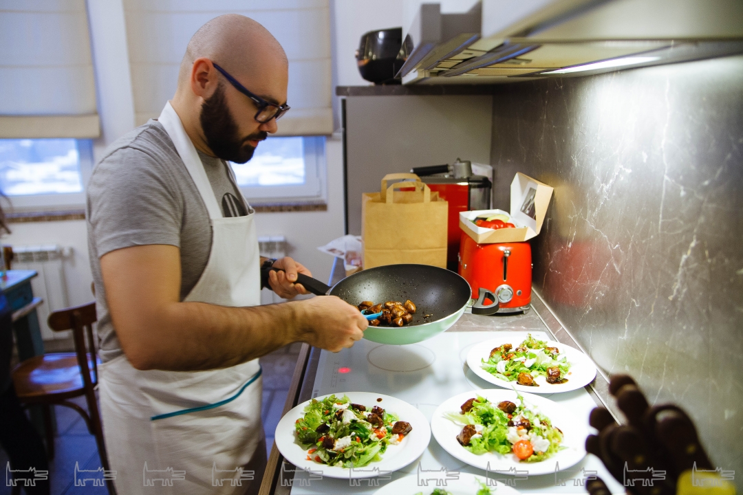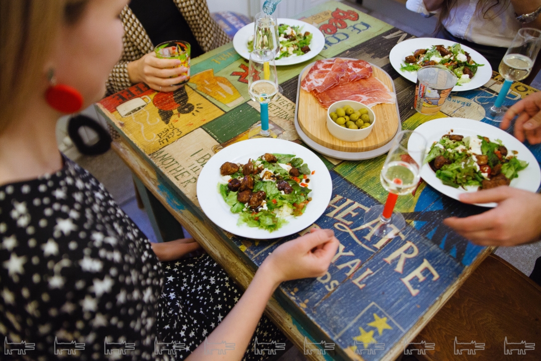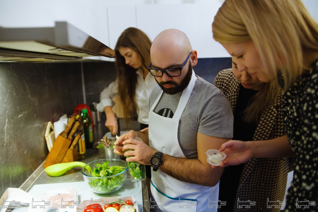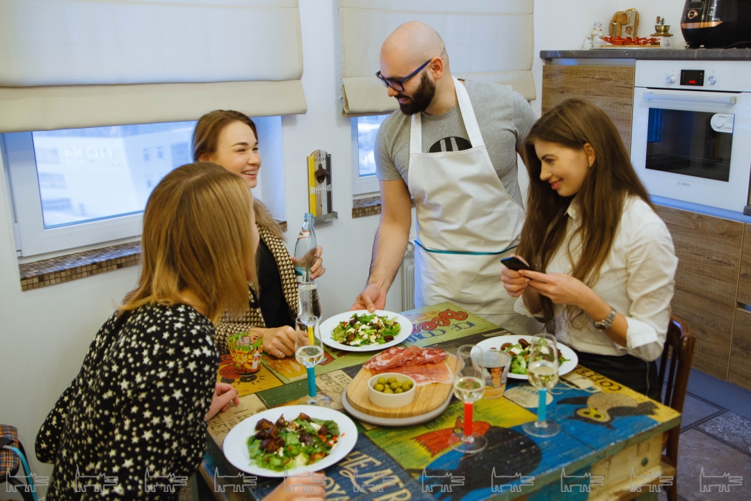 Первый наш опыт так нам понравился и увлек всех, что мы решили увеличить число участников и подключили нового тестера, так что у Миши мы собрались уже в расширенном составе. В этот раз усидеть на месте до подачи блюд ни у кого не хватило терпения, и мы все активно включились в кулинарный процесс. Работать в команде оказалось очень круто! Особенно когда в твоем функционале – разделение на волокна моцареллы, перемешивание салата и посыпание мяса перцем. Каждому – по способностям!