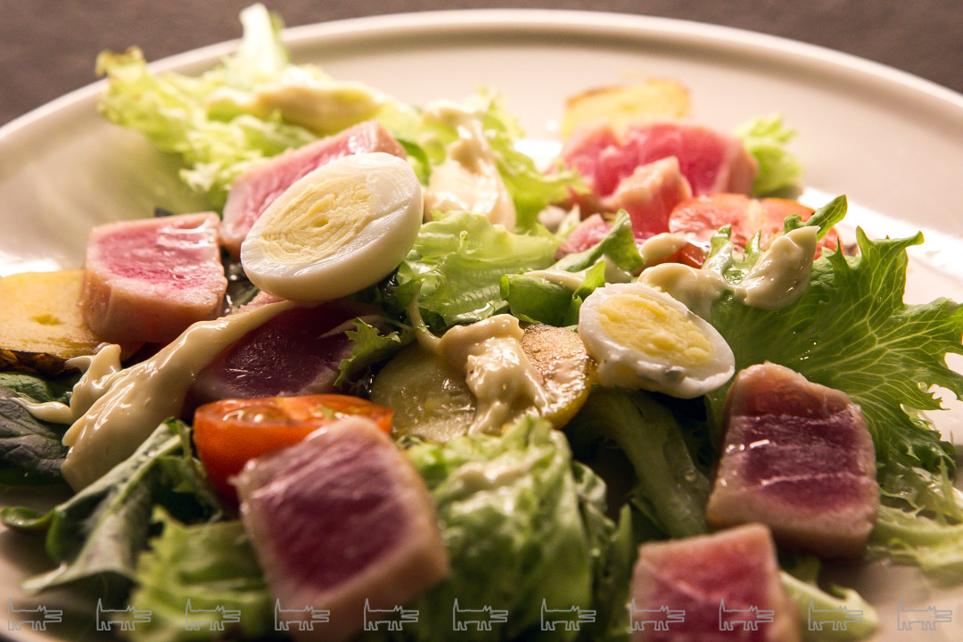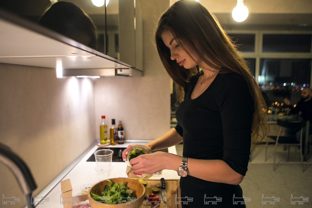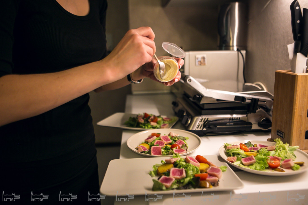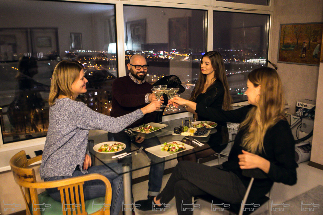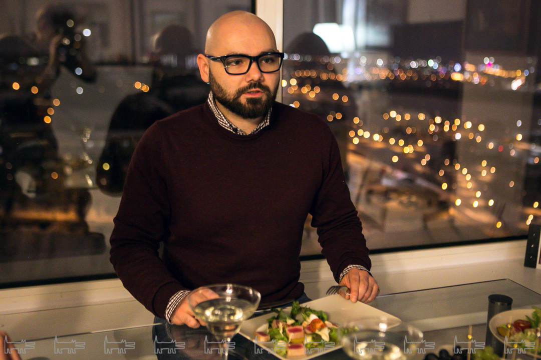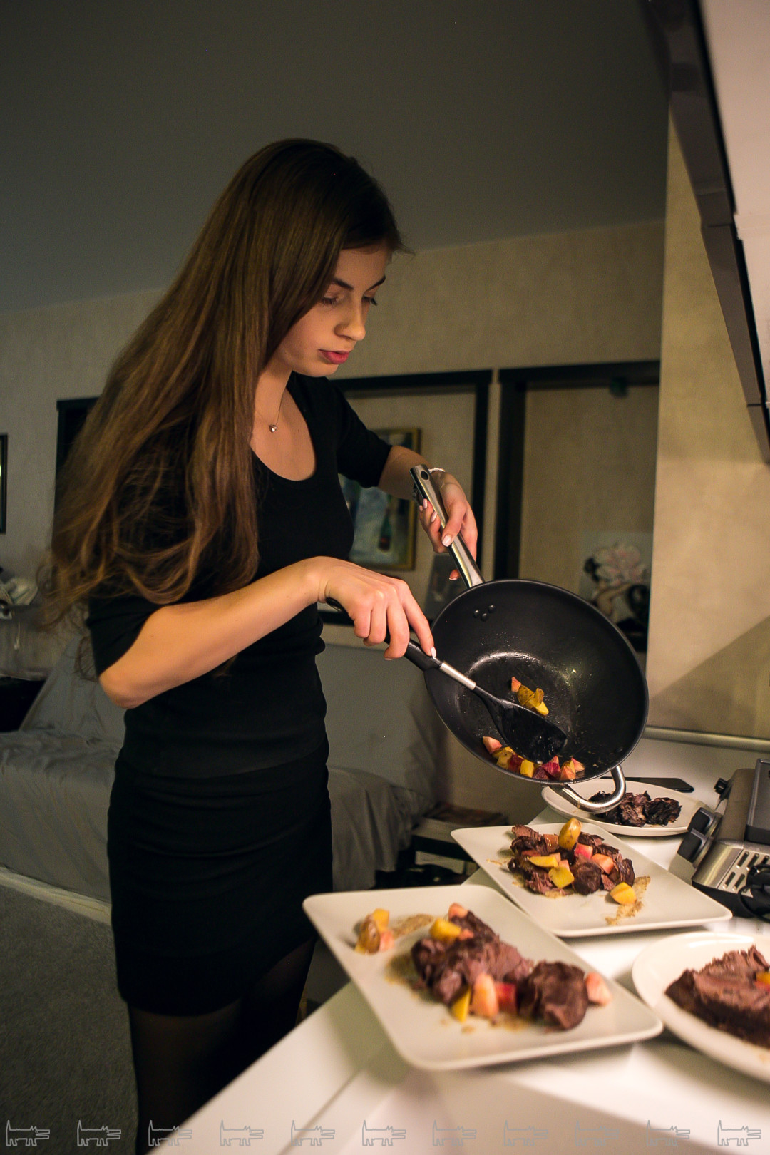 Финальный ужин стал настоящей вишенкой на торте всего проекта. Во-первых, из квартиры открывается просто потрясающий вид на Нижегородскую ярмарку, собор Александра Невского и стадион, а в вечернее время, когда весь город в огнях, от такой картинки просто дух захватывает! Во-вторых, с выбором блюд хозяйка попала в десятку. На мой взгляд, это лучшее сочетание из представленных на данный момент в меню «Белого фартука» – салат «Нисуаз» с жареным тунцом и щечки теленка в красном вине. Эта часть говядины очень вкусная, а мясо необыкновенно нежное. Надо будет обязательно попробовать приготовить их самому. Надеюсь, меню «Белого фартука» будет расширяться со временем. Я бы, например, с удовольствием заказал салат с креветками и горячее блюдо из утки.