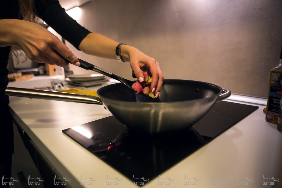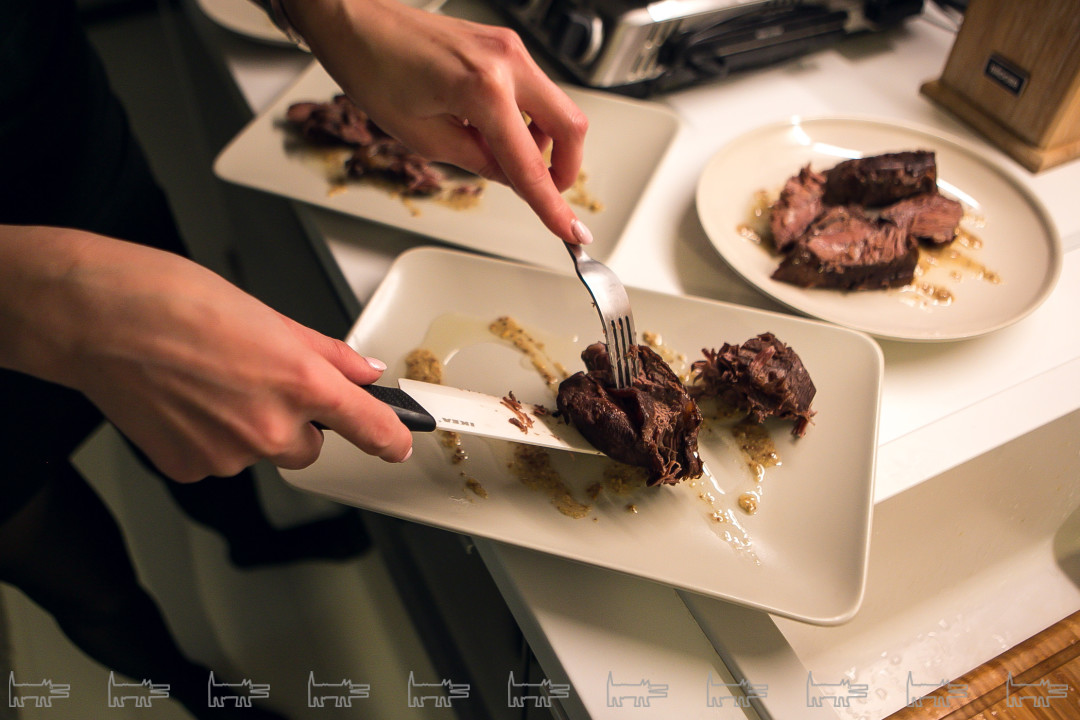 Ужин у Нины стал прекрасным завершением нашего проекта. Мы все уже действительно сдружились и чувствовали себя максимально комфортно. Символично, что в финале проекта от «НН.Собака.ru» присутствовала настоящая собака – чудесный шарпей по имени Ева. У нее на ужин были бананы, а у нас – салат «Нисуаз» и щечки теленка. Все остались довольны. Мне особенно понравилась закуска: обожаю тунца, а тут он еще был просто идеально прожарен, оставшись внутри максимально сочным. Кстати, хочу отметить, что, несмотря на рекомендованное по рецепту использование духовки при приготовлении всех горячих блюд «Белого фартука», со щечками в отсутствие духовки хозяйка ловко управилась, используя сковороду и гриль. И получилось отлично!