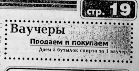 Иностранные языки от «научно-творческой» группы гипнотизеров (со степенью кандидатов наук), объявления о покупке пяти литров спирта за ваучер и, конечно, реклама уникальных методик Кашпировского — эти и многие другие объявления из перестроечного прошлого можно будет увидеть на выставке, которая откроется 14 марта в «Этажах». По материалам газеты «Реклама Шанс» организаторы создали хронику желаний за последние 20 лет (1991 − 2011 гг). Как менялись жизненные запросы людей и изменились ли требования к идеальной жене с 91-го года — узнать можно будет со страниц архивных выпусков издания.